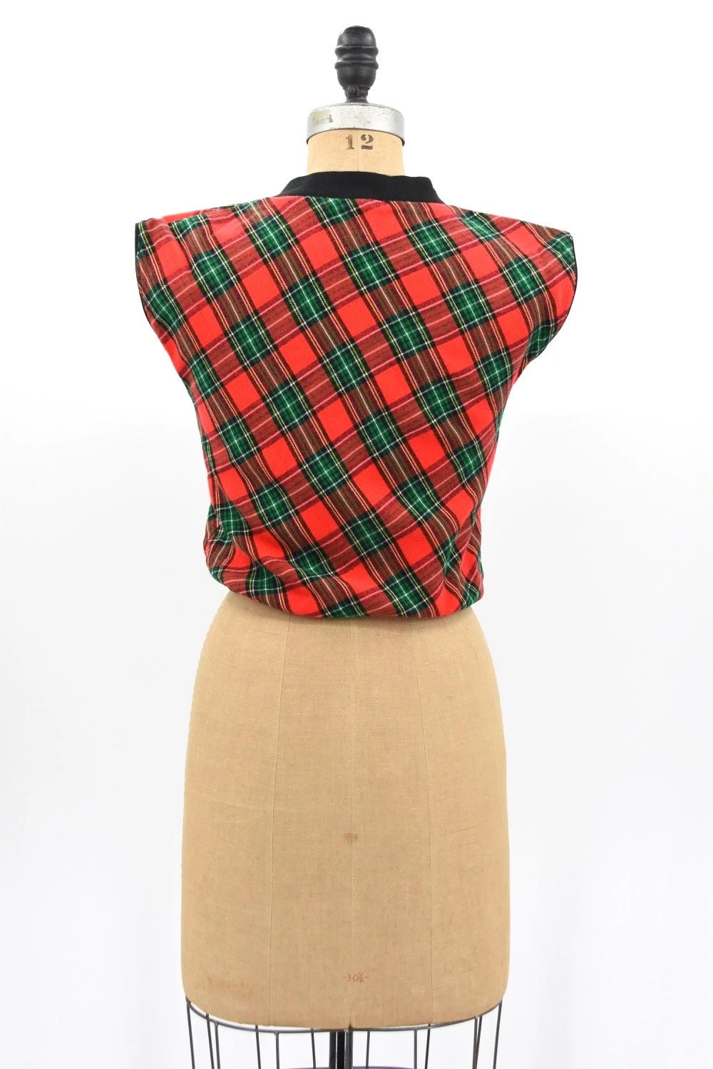Vintage 1960s vest. Tartan wool in a winter holiday color scheme. Knit ribbed v collar, sleeveless and ribbed waist. Slips on overhead, no closure.