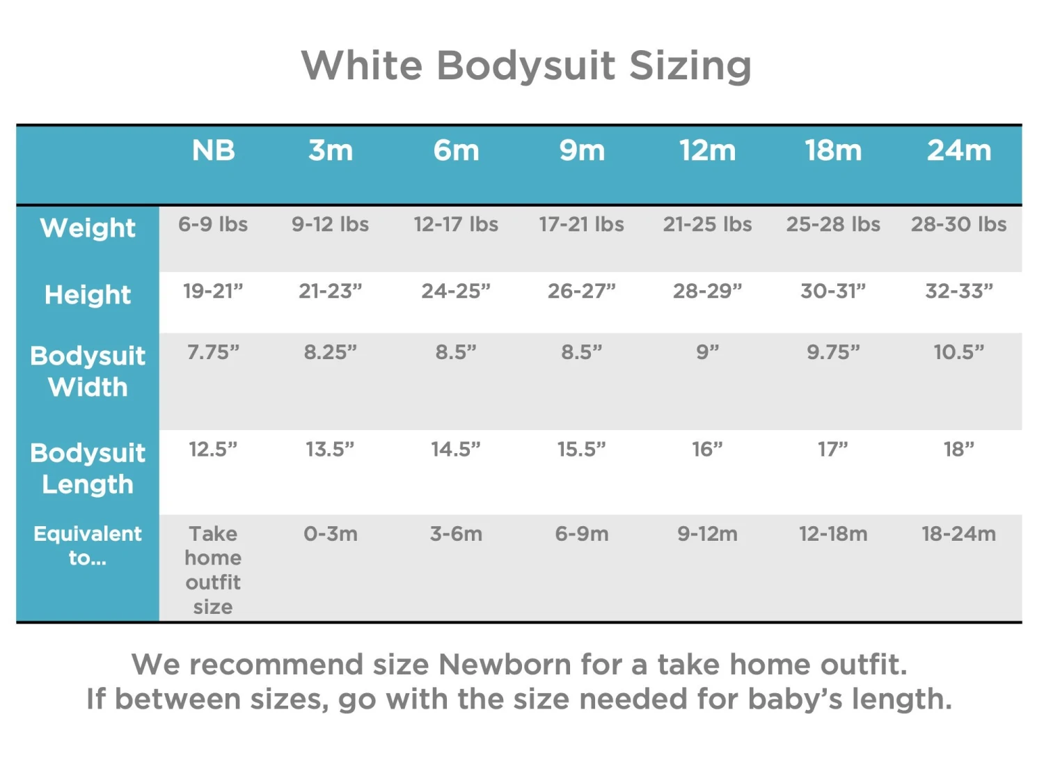 | Size | Newborn short sleeve, Newborn long sleeve, 3m short sleeve, 3m long sleeve, 6m short sleeve, 6m long sleeve, 9m short sleeve, 9m long sleeve, 12m short sleeve, 12m long sleeve, 18m short sleeve, 18m long sleeve, 24m short sleeve, 24m long sleeve |