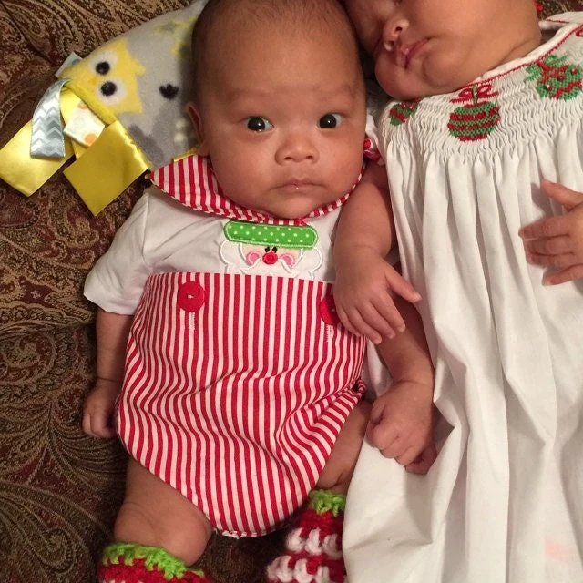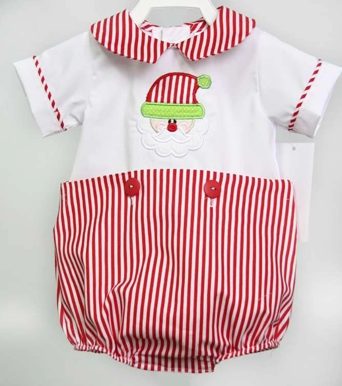 He will have that look you love in a baby boy Christmas outfit by Zuli Kids. Infant boy Christmas outfit is a baby boy romper with red stripe pants and white shirt. Available with or without Santa applique.