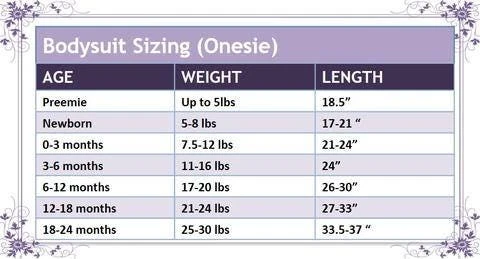 | Size | Newborn Short Sleeve, Newborn Long Sleeve, 0-3M Short Sleeve, 0-3M Long Sleeve, 3-6M Short Sleeve, 3-6M Long Sleeve, 6-12M Short Sleeve, 6-12M Long Sleeve, 12-18M Short Sleeve, 12-18M Long Sleeve, 18-24M Short Sleeve, 18-24M Long Sleeve |