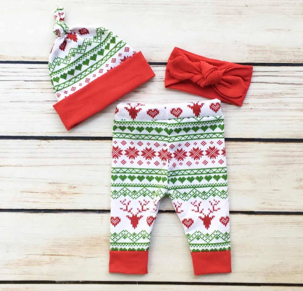 Baby Girls Coming Home Outfit, Red And Green Leggings,Hat And Headband With Red Cuffs, Baby’s First Christmas Outfit