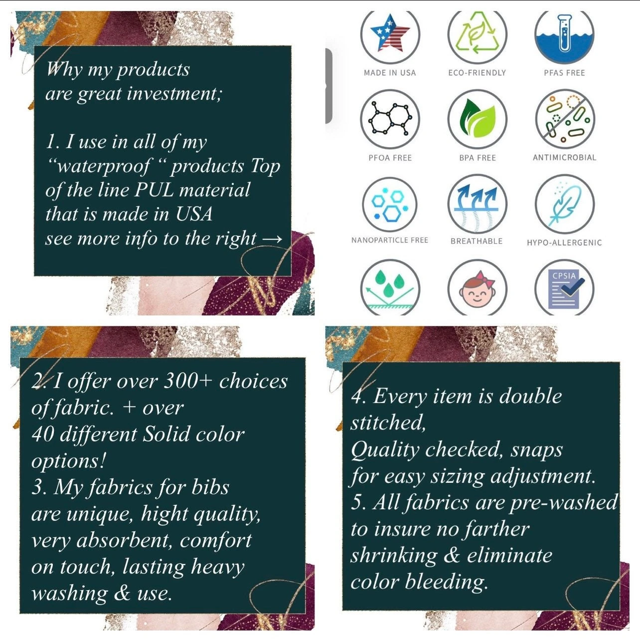 This Droolie is made to order out of very soft, absorbent great quality cotton knit fabric that have some stretch to it, and great absorbency. Waterproof bibs has layer of water resistant material that helps with excessive drooling or spills. Bibs made very well and stitched twice for a long use.