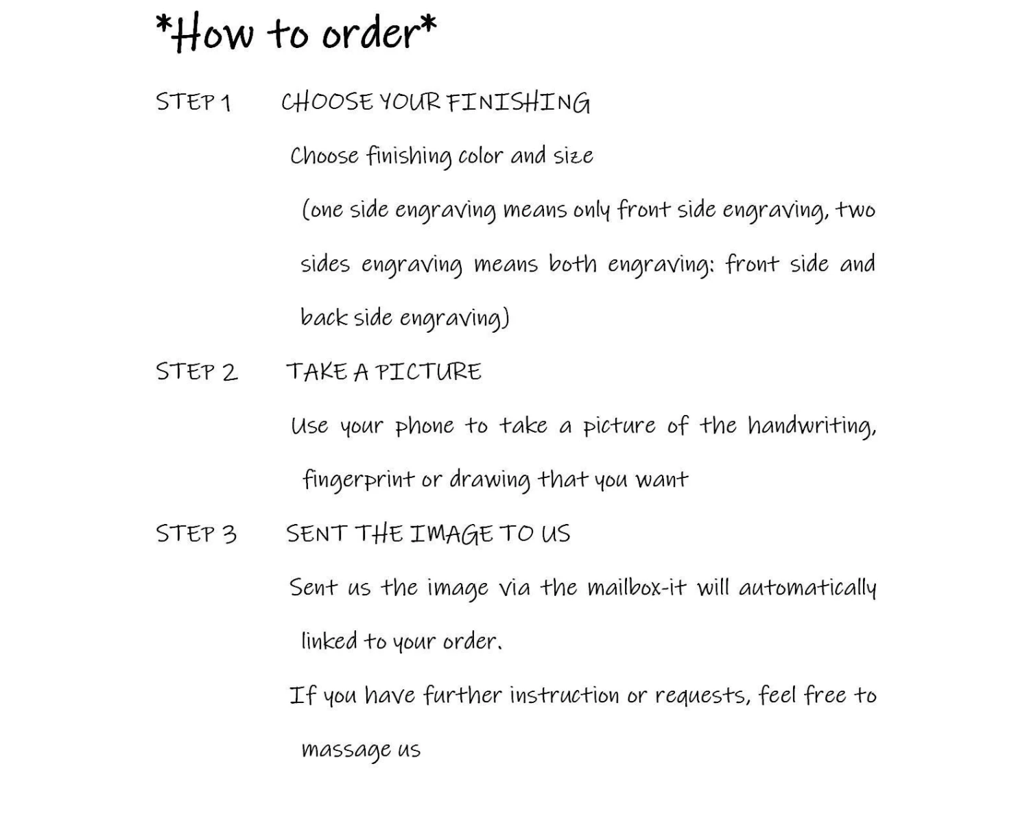 • Simply use the -ASK A QUESTION- or -CONTACT SHOP OWNER- button to send us a picture or scan of the Fingerprint//Artwork//Handprint//Footprint// Photos before or after purchasing.(My email is miadesign2017 [!at] gmail.com)