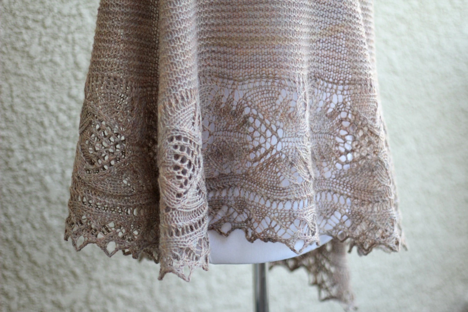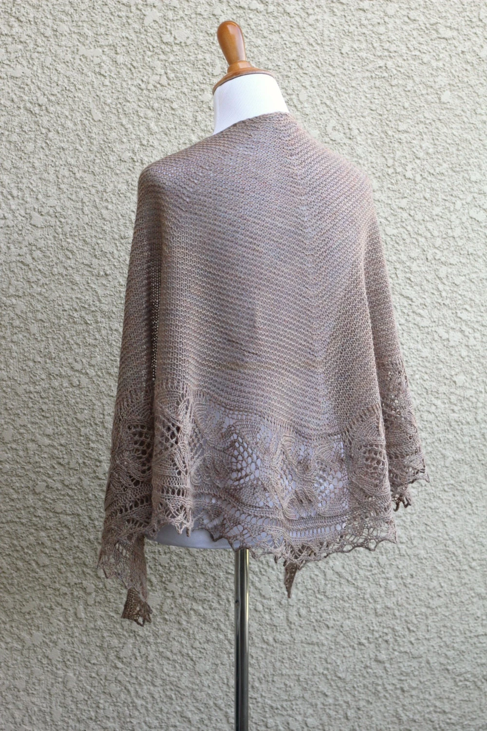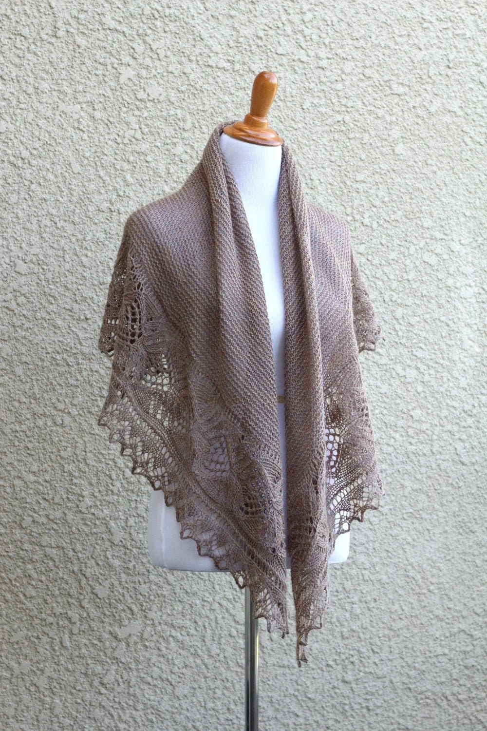 This hand knit shawl is made of 100% wool in lovely beige color. The yarn is heather which means it has a few different shades in the thread (different shades of beige, light pink and grey shades mixed up; very interesting look).