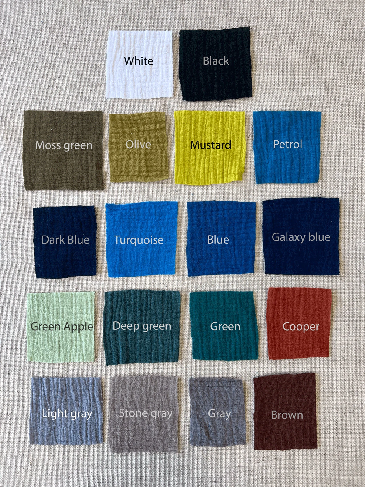 | Color | White, Black, Moss green, Olive, Mustard, Petrol, Dark blue, Turquoise, Blue, Calaxy blue, Green apple, Green, Cooper, Light gray, Stone gray, Gray, Brown |