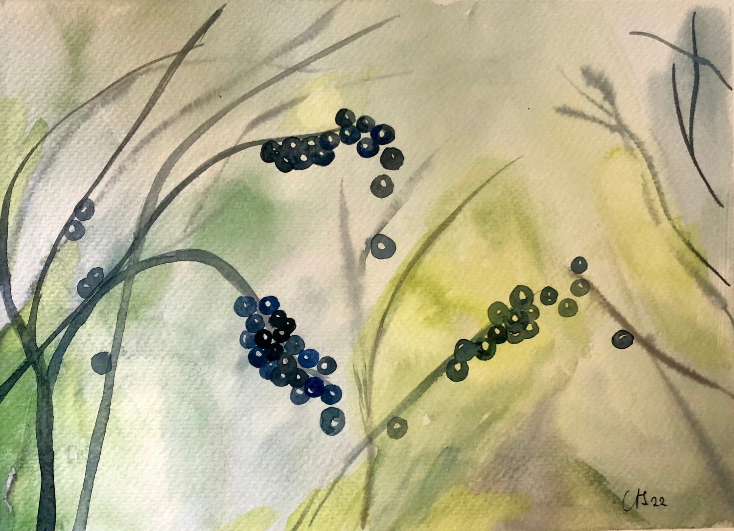 An original watercolor painting of a Christmas and winter scenery with dark wild berries.