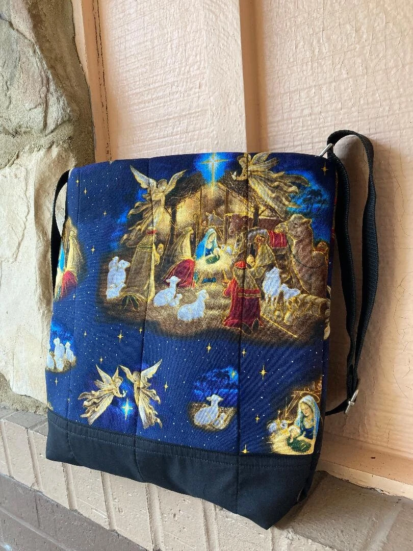 Christmas Quilted Crossbody Bag. The inside is lined and has two handy pockets. There is a magnetic snap closure at the top of the bag. The strap is adjustable. All materials are washable should laundry become necessary. It is large enough and durable enough to carry everything you need. I hand make all bags in my home in a smoke-free and non-toxic environment.