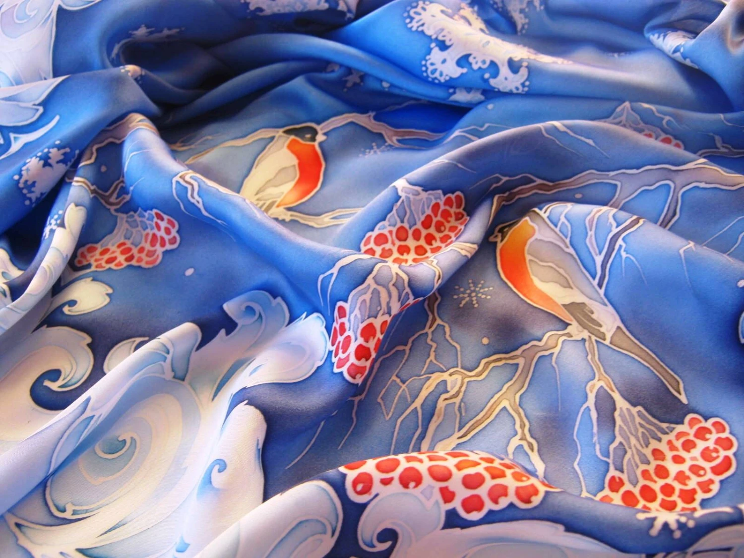 silk scarf handpainted, bullfinch, 36×36 inches , winter gift, for women , scarf square , head scarf silk , neck scarf, Christmas gift