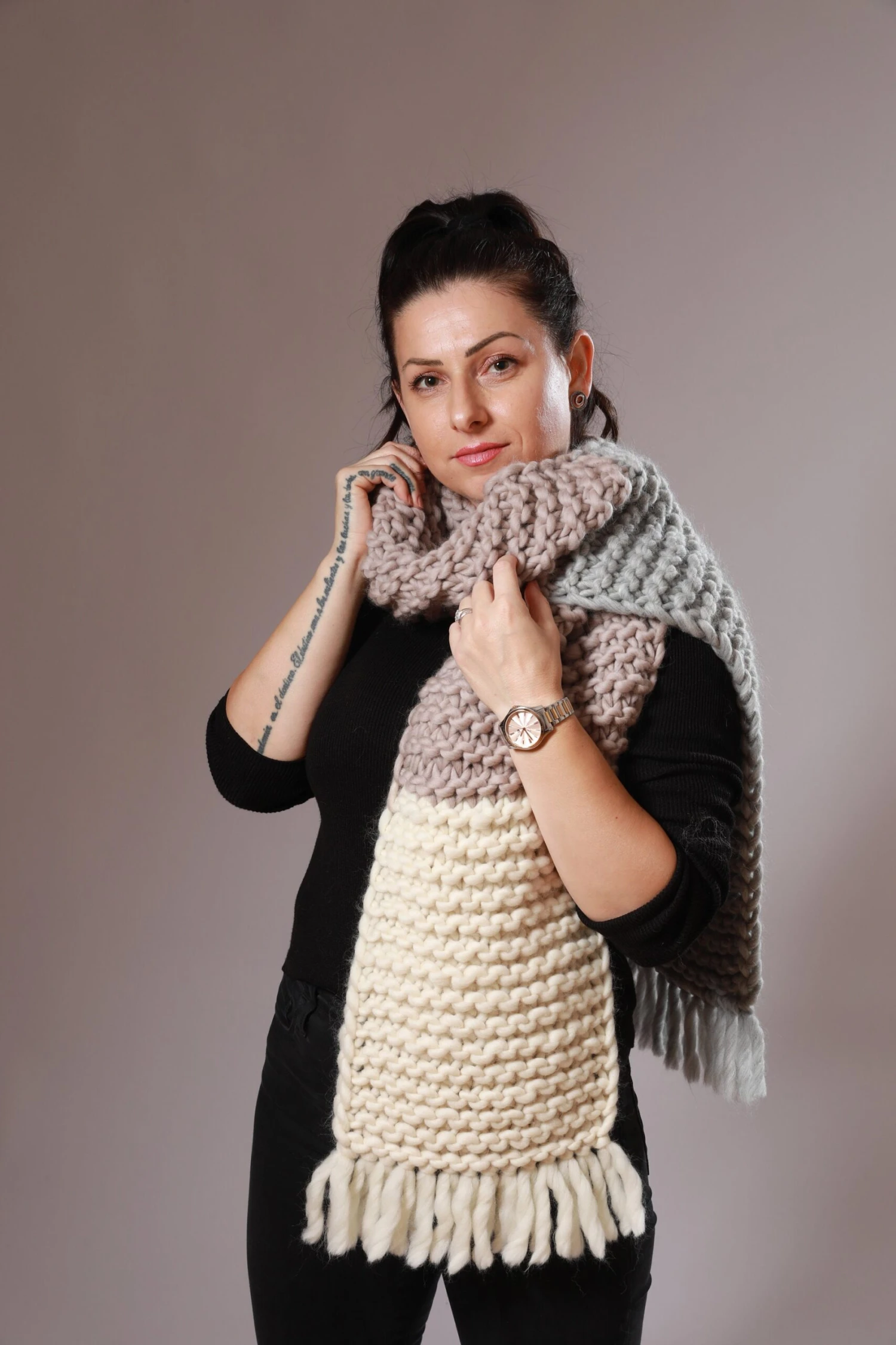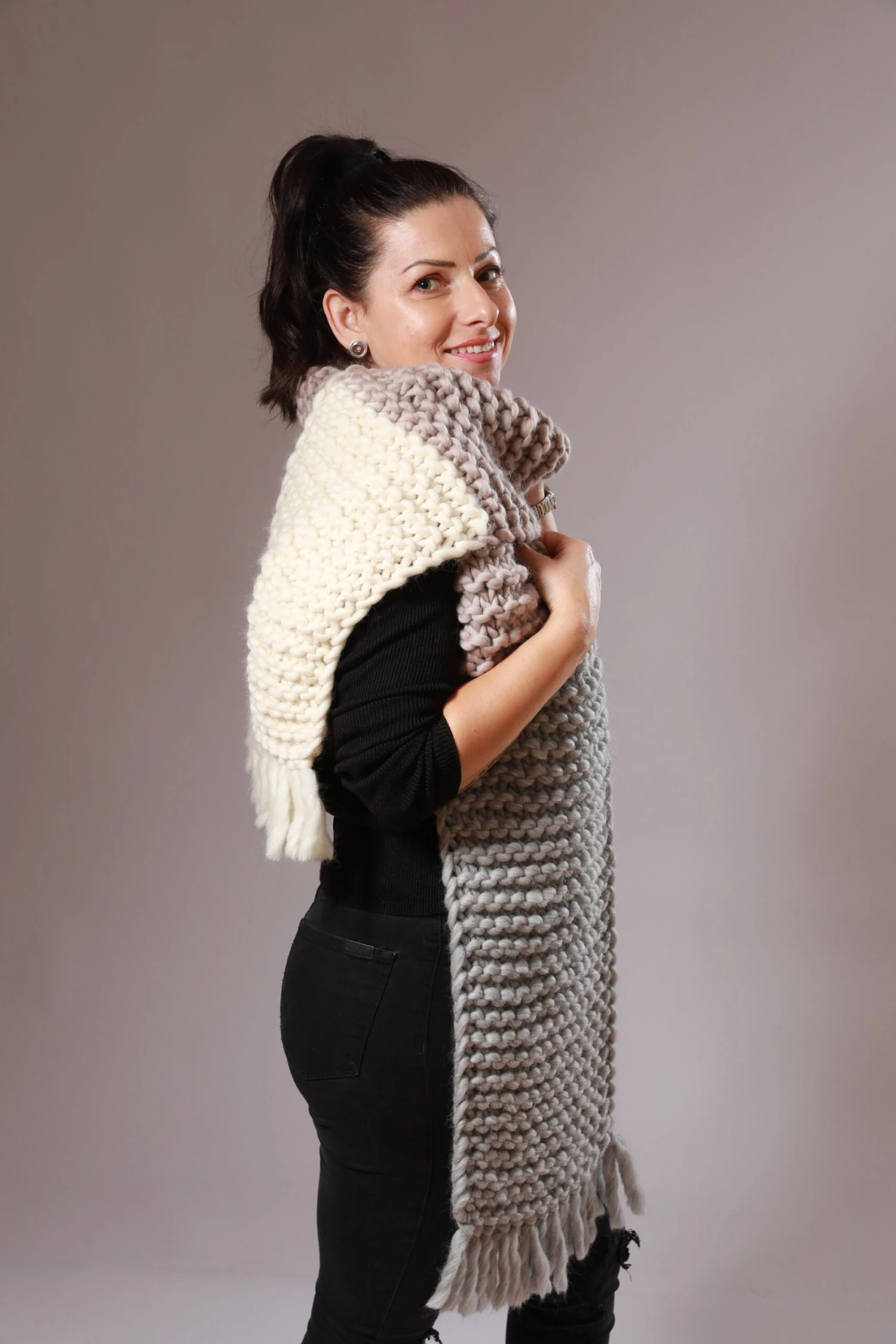 READY TO SHIP soft and chunky knit scarf with fringe in the colours Sandtrooper Beige, Rocky Grey and Ivory White