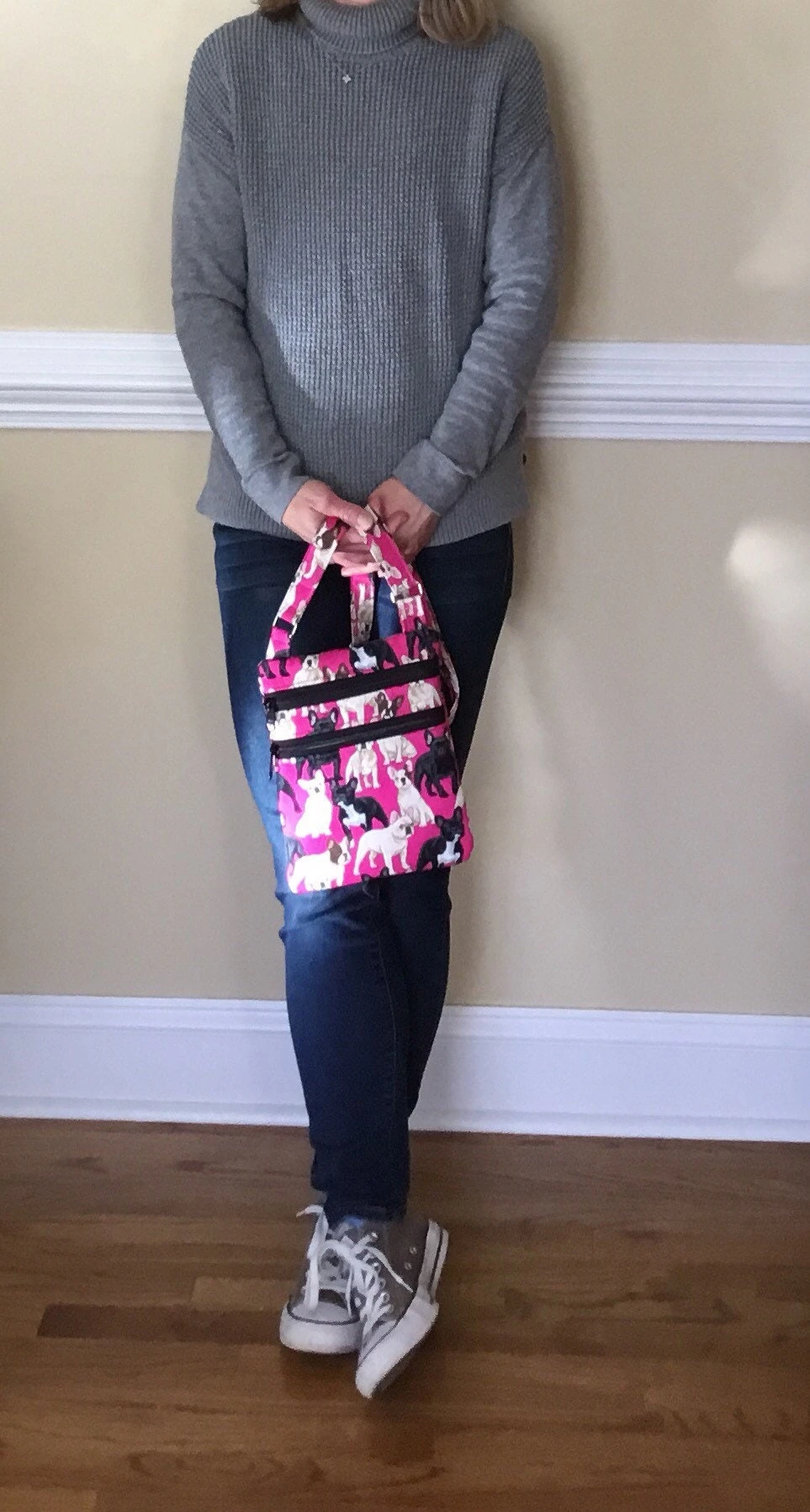 Cotton fabric with a Corgi theme has been used for this cute little bag. A coordinating fabric is used for the interior pockets. Strong and durable YKK handbag zippers add a professional finish to the bag.