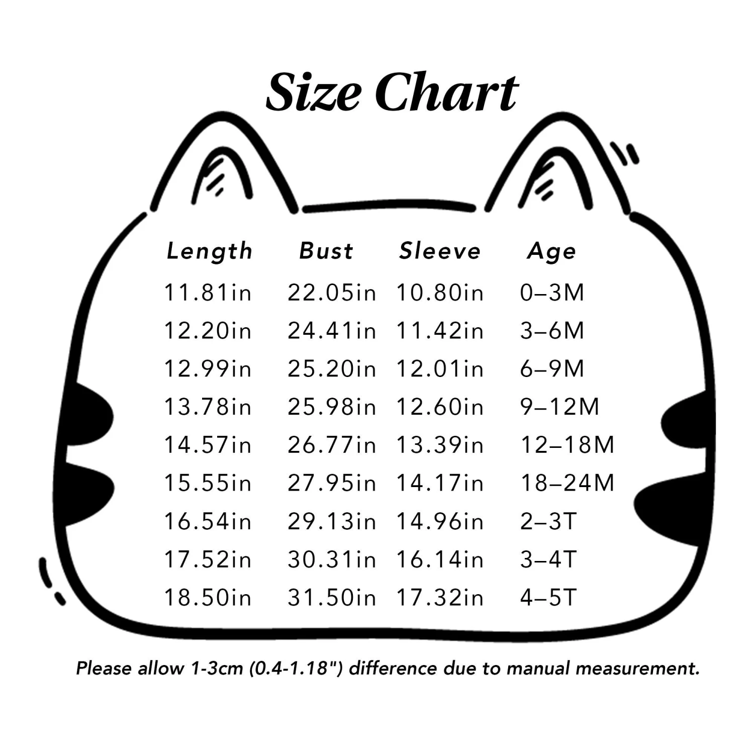 | Size | 0-3 months US kids' numeric, 3-6 months US kids' numeric, 6-9 months US kids' numeric, 9-12 months US kids' numeric, 12-18 months US kids' numeric, 18-24 months US kids' numeric, 2-3T US kids' numeric, 3-4T US kids' numeric, 4-5T US kids' numeric |