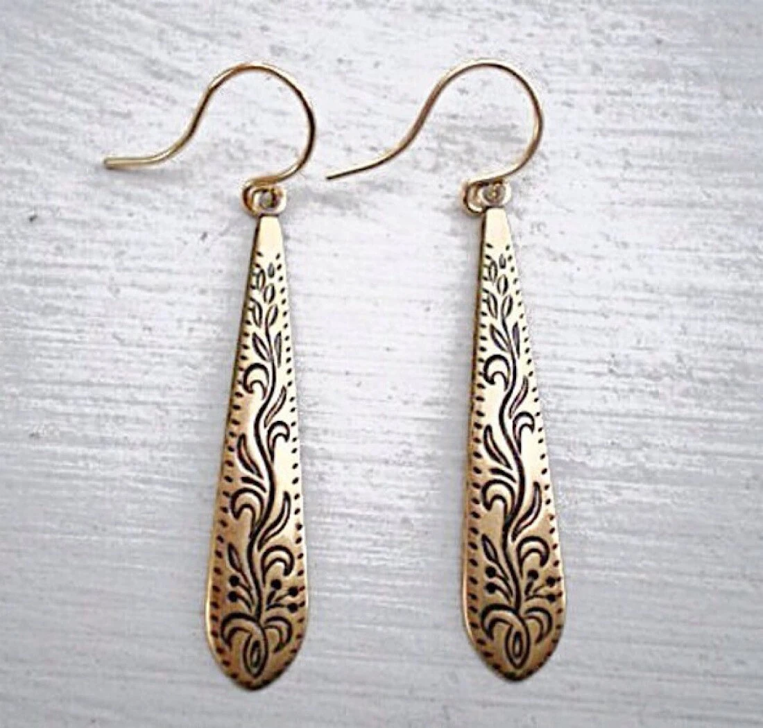 The gold plated etched drops hang from gold plated ear wires and measure 1 3/4 inches in length and 1/4 inch at widest point…The drops alone measure 36x12mm (very dainty).