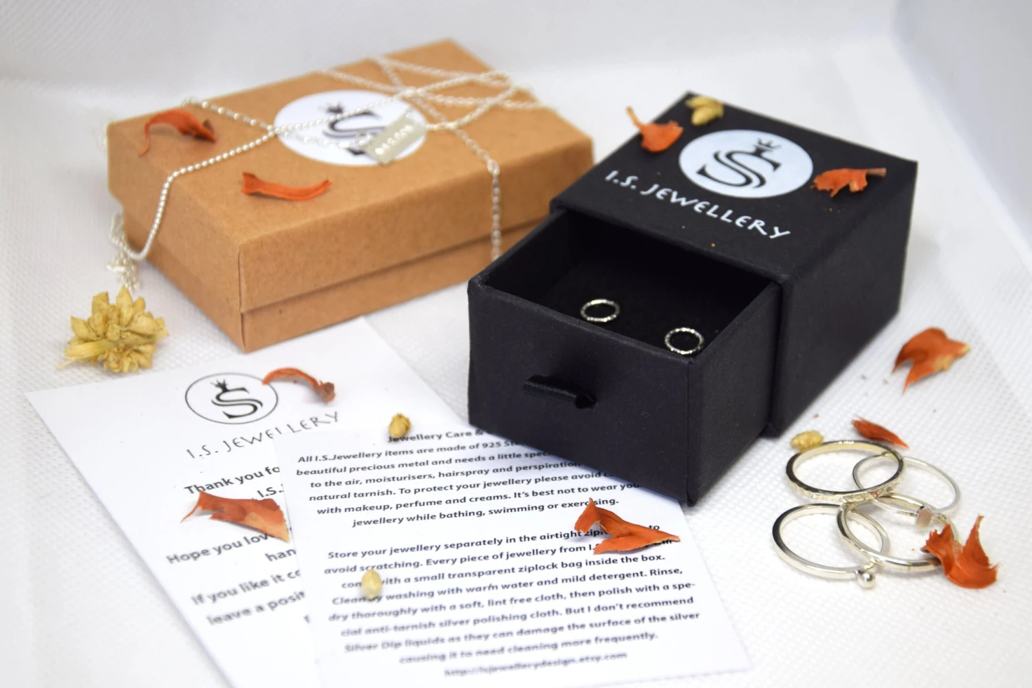 Your jewellery will be beautifully wrapped with paper and ribbons. It will also come with a gift card, and you can add a gift message during checkout.