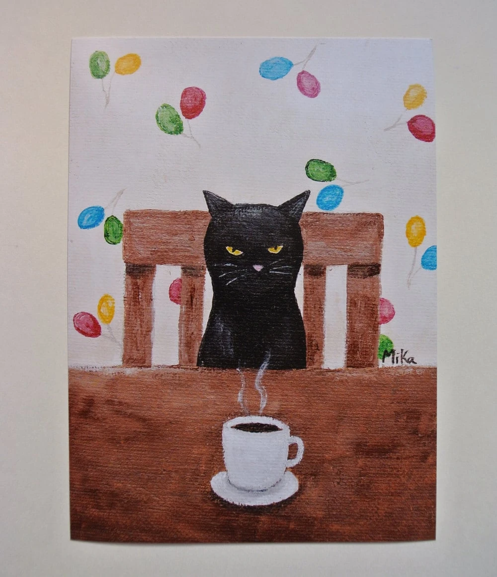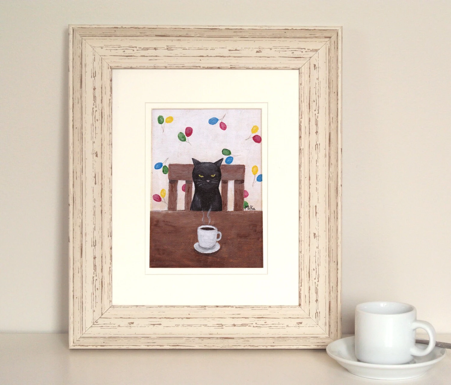 This is a print of my illustration “Black cat with a cup of coffee”. Some cats like their coffee black, with little bits of grounds in it.