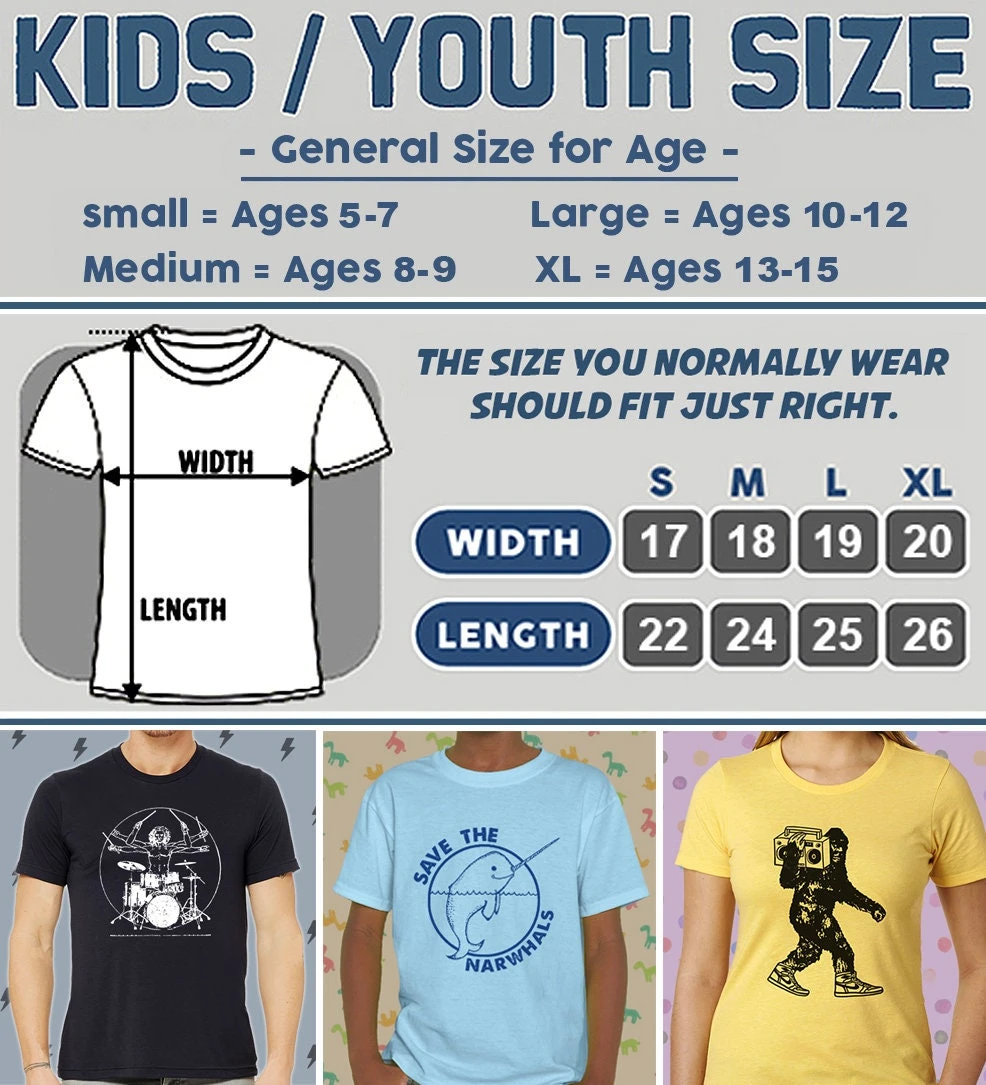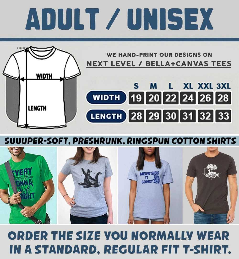 Adult unisex t shirts – Order the size you would typically wear in a standard, normal fitting t shirt. If you are between sizes, or just like a looser fit, you may want to order a size up. (see models and size chart in our images)