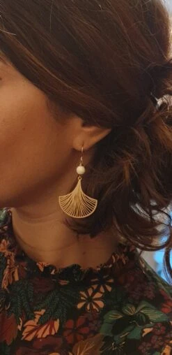 Golden dangling earrings with pretty ginkgo leaf charm, natural ivory howlite pearl