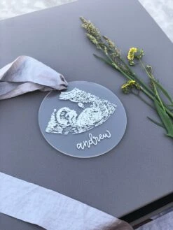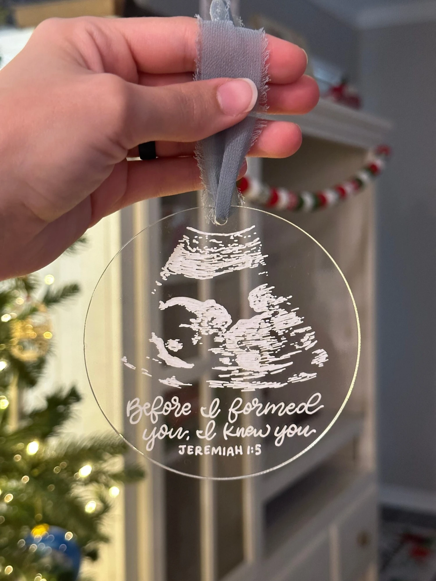 Each transparent acrylic round (4” diameter, 0.08” thickness) is carefully painted based on a provided ultrasound photo and hand-lettered with an oil based paint. Because this is a hand painted and hand lettered product, slight variation can be expected if multiple ornaments are ordered. Each ornament comes with the choice of a white, blush pink, or dusty blue chiffon silk ribbon or twine as the hanger.