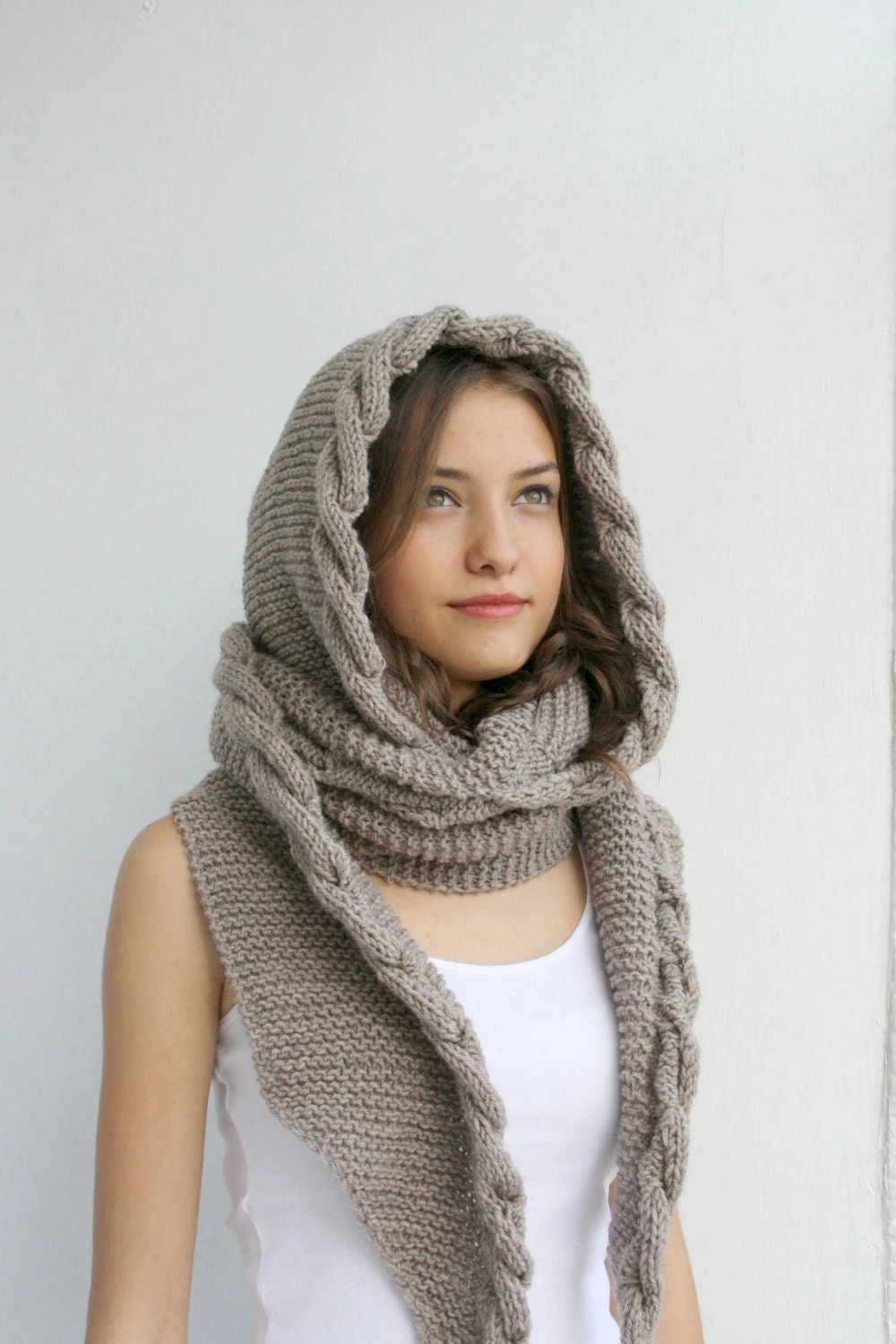 Hand Knit Milky Brown Wool Hooded Scarf, Cable Long Hoodie Scarves, Autumn Gifts, Knit Scarf, Outdoors Gift, Christmas Gifts, Gift for Her, Woman Fashion Trends.