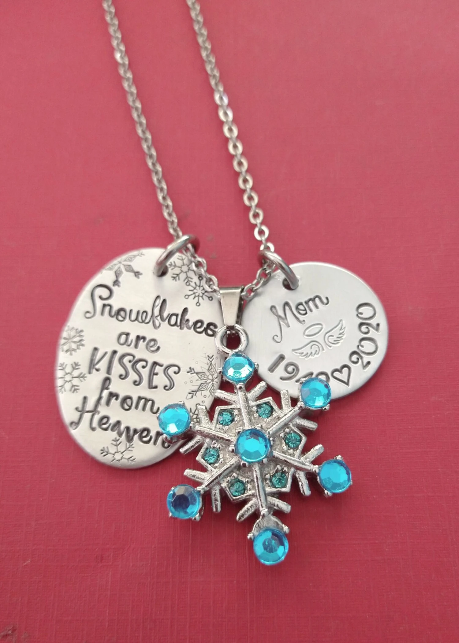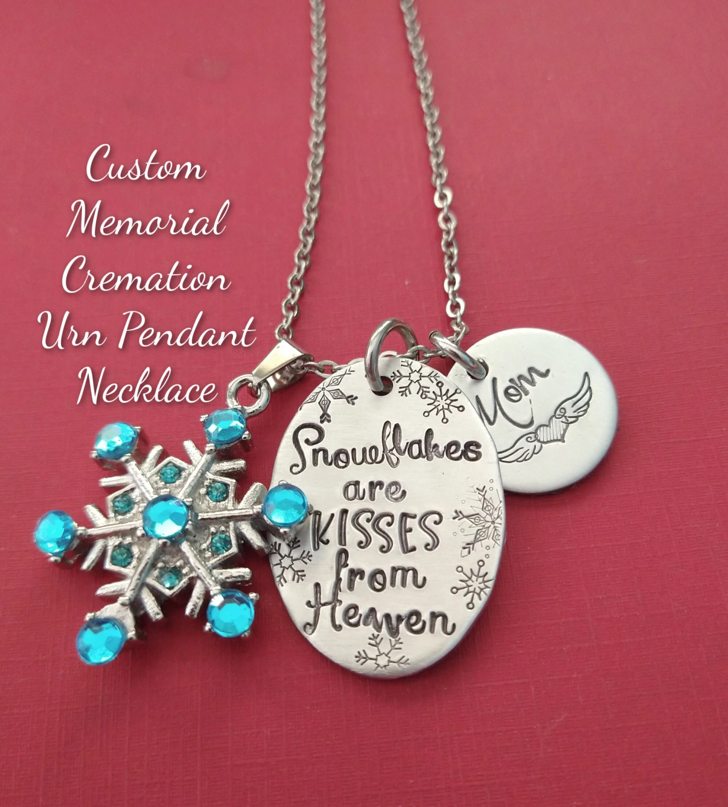 Necklaces comes with the crystal embellished snowflake cremation urn made from 316L stainless steel, a custom-stamped oval pendant and a custom-stamped disc.