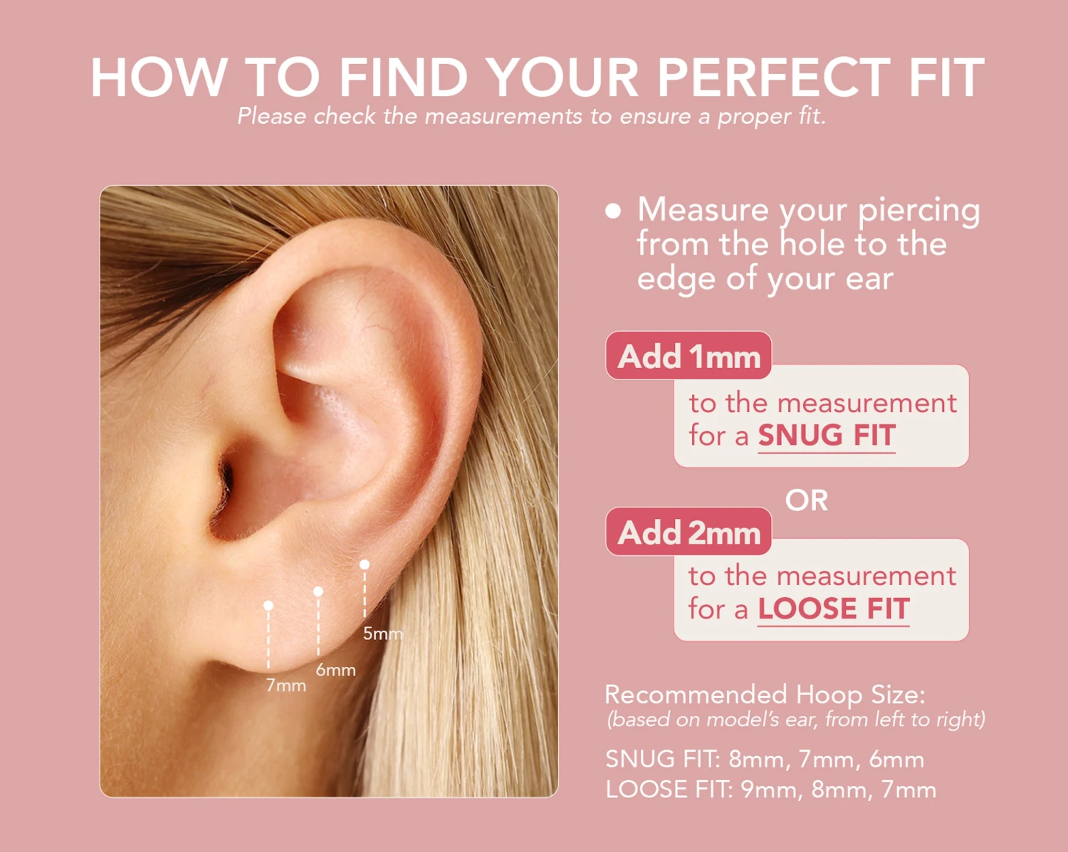 7 mm – If you have a smaller ear lobe, these 7 mm hoops can be worn on the first piercing of the earlobe. They can also be worn on your second piercing!