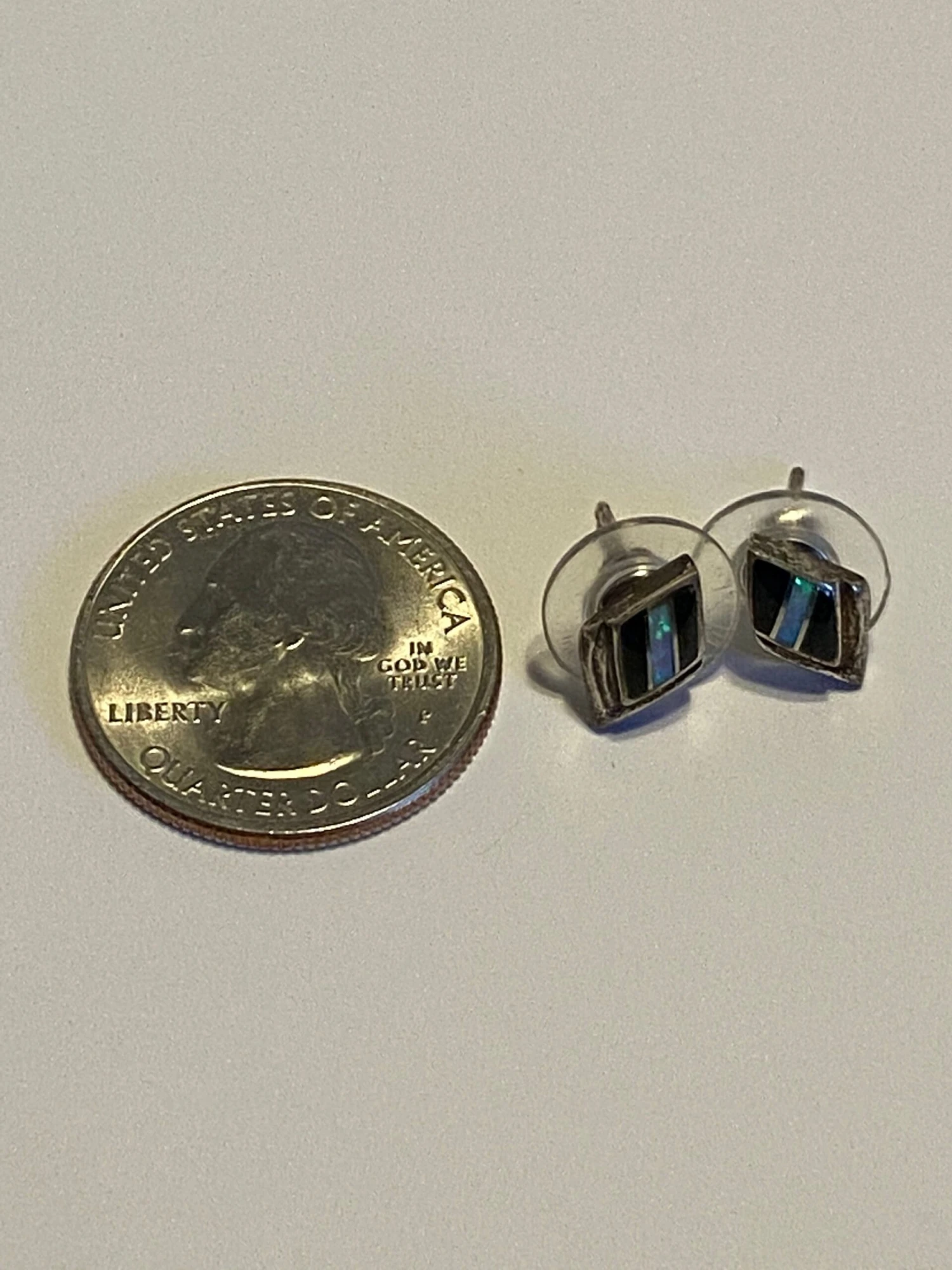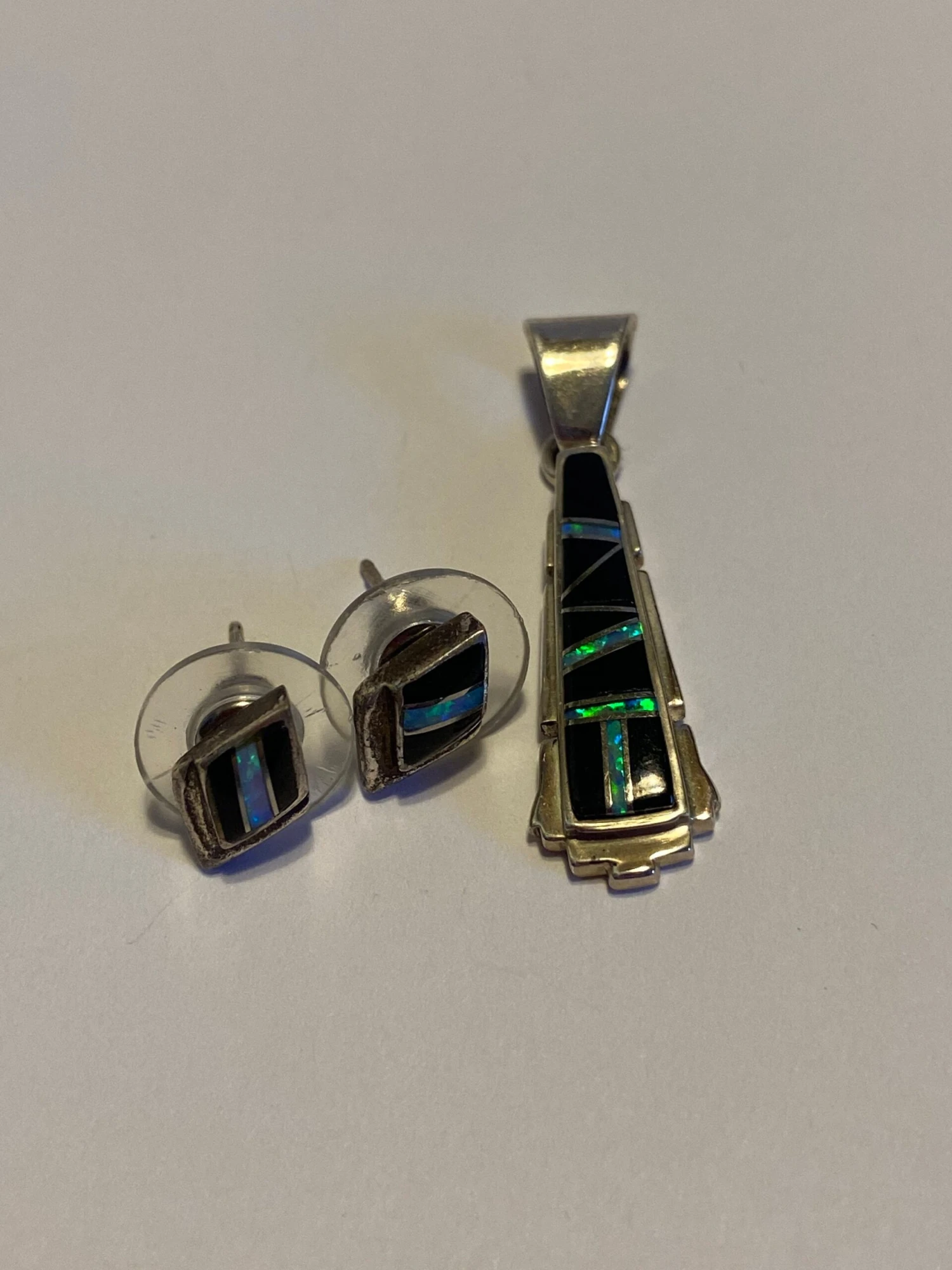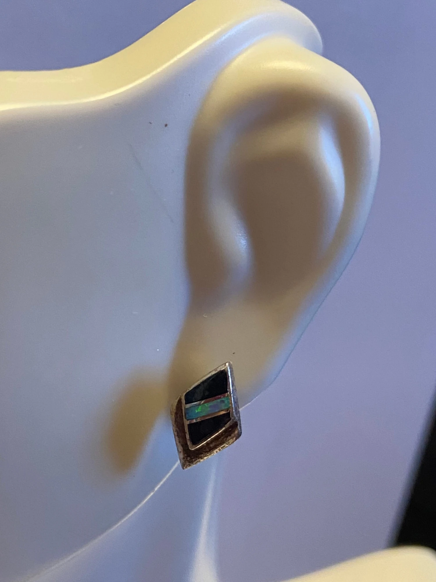 This is a gorgeous pair of vintage, genuine Navajo inlaid sterling silver earrings with genuine opal and jet.