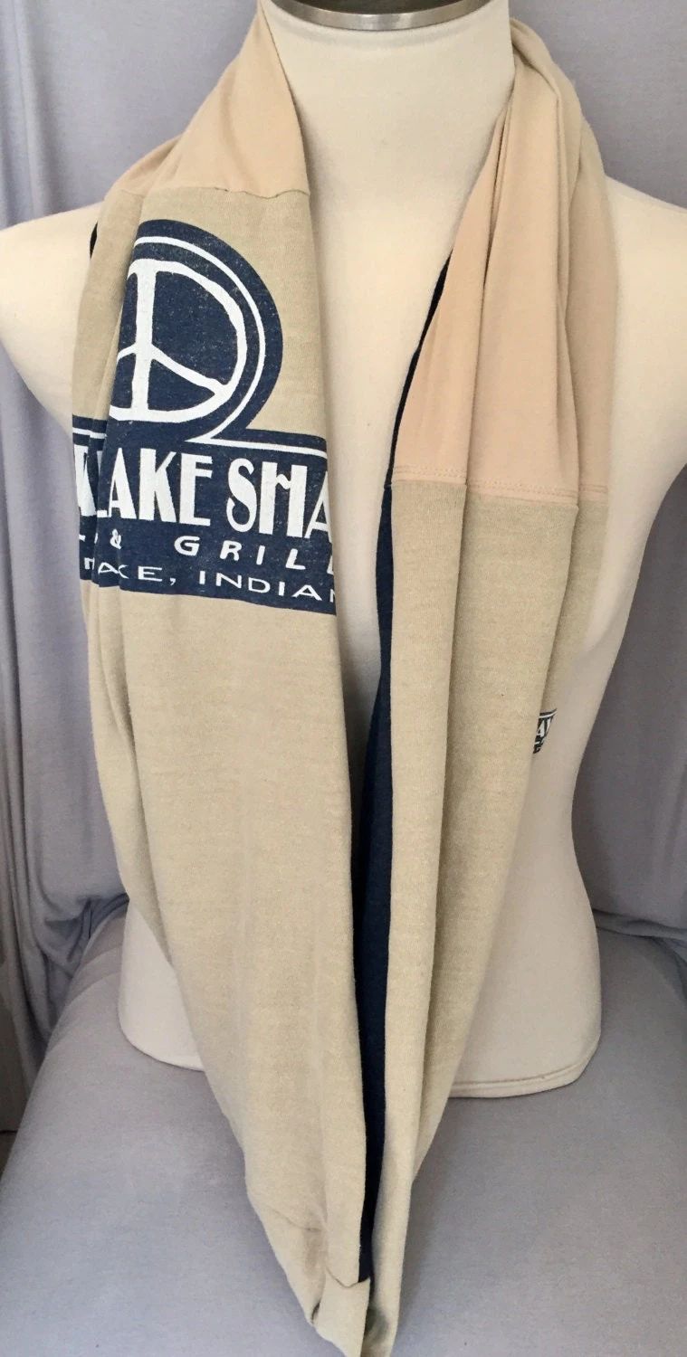 Gotta love this OOAK, Random T shirt Logo Scarf, in classic Navy Blue and Beige.