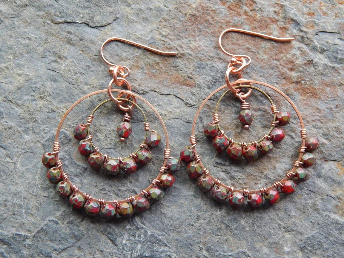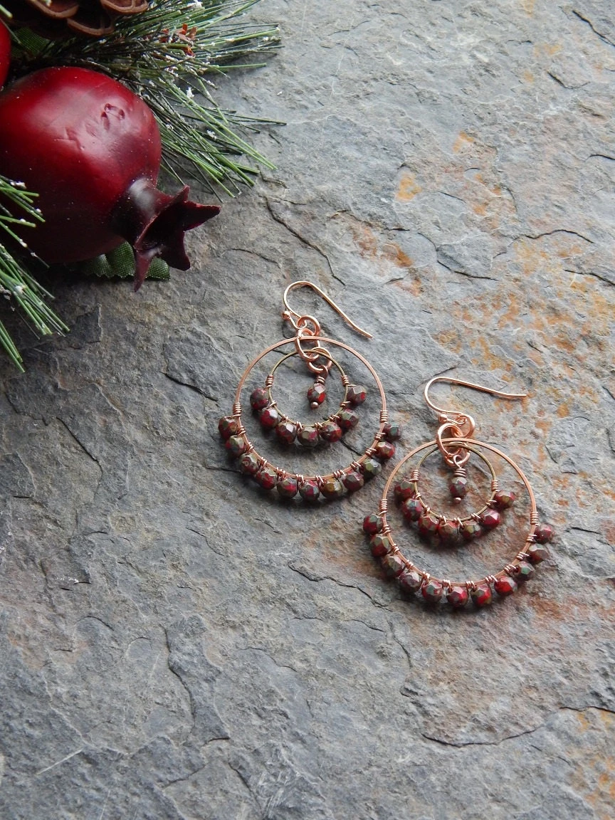 These hoops feature faceted picasso czech glass beads in olive green and red. The color combination in these beads is perfect for the holidays.