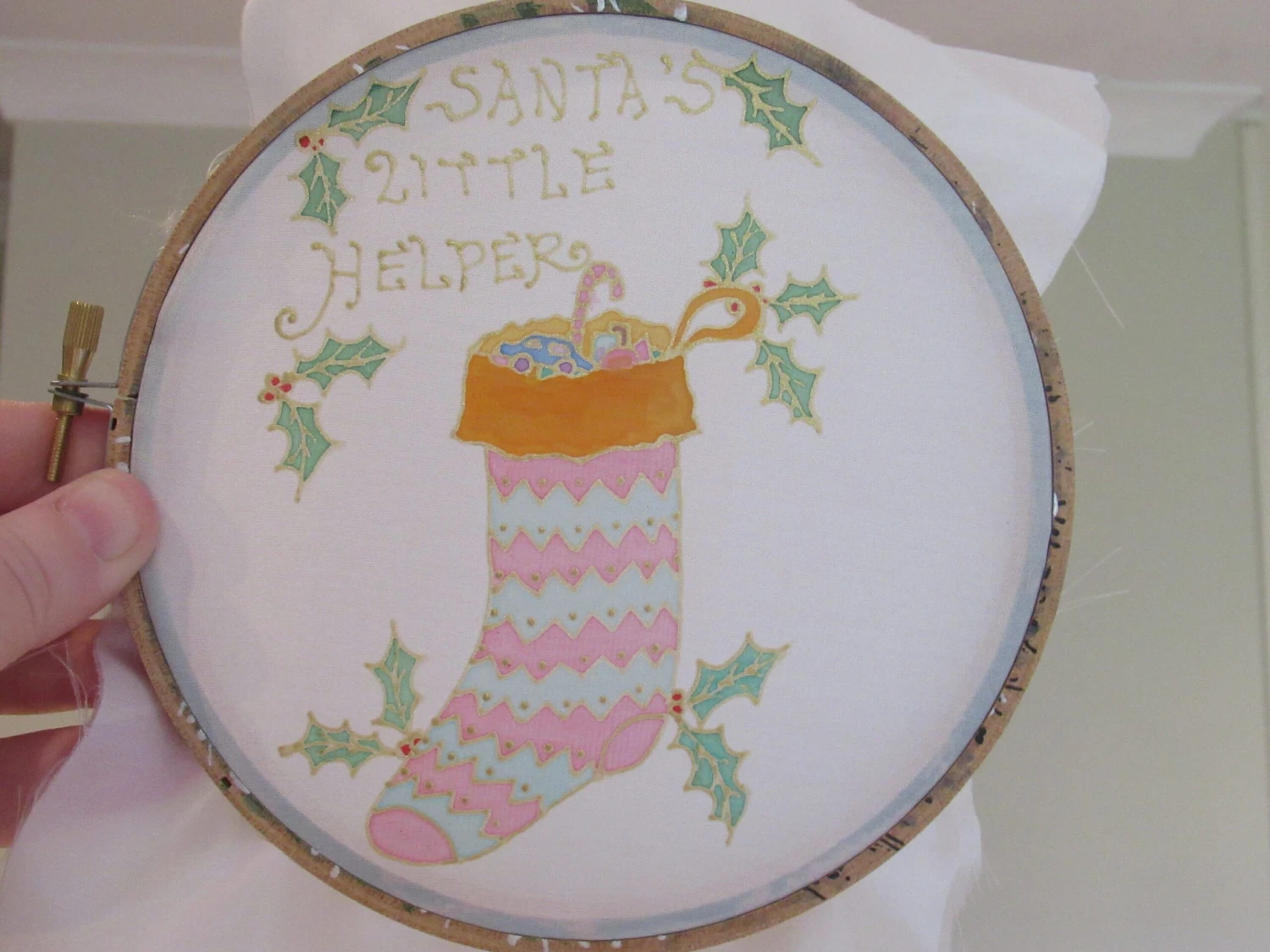 I created this beautiful wall art, which is made from real Habotai silk by carefully stretching the silk over an embroidery hoop. I then drew directly onto the silk with gold gutta (outliner). After 8 hours when the gutta is completely dry I hand painted the stocking using specialist Setasilk silk paints.