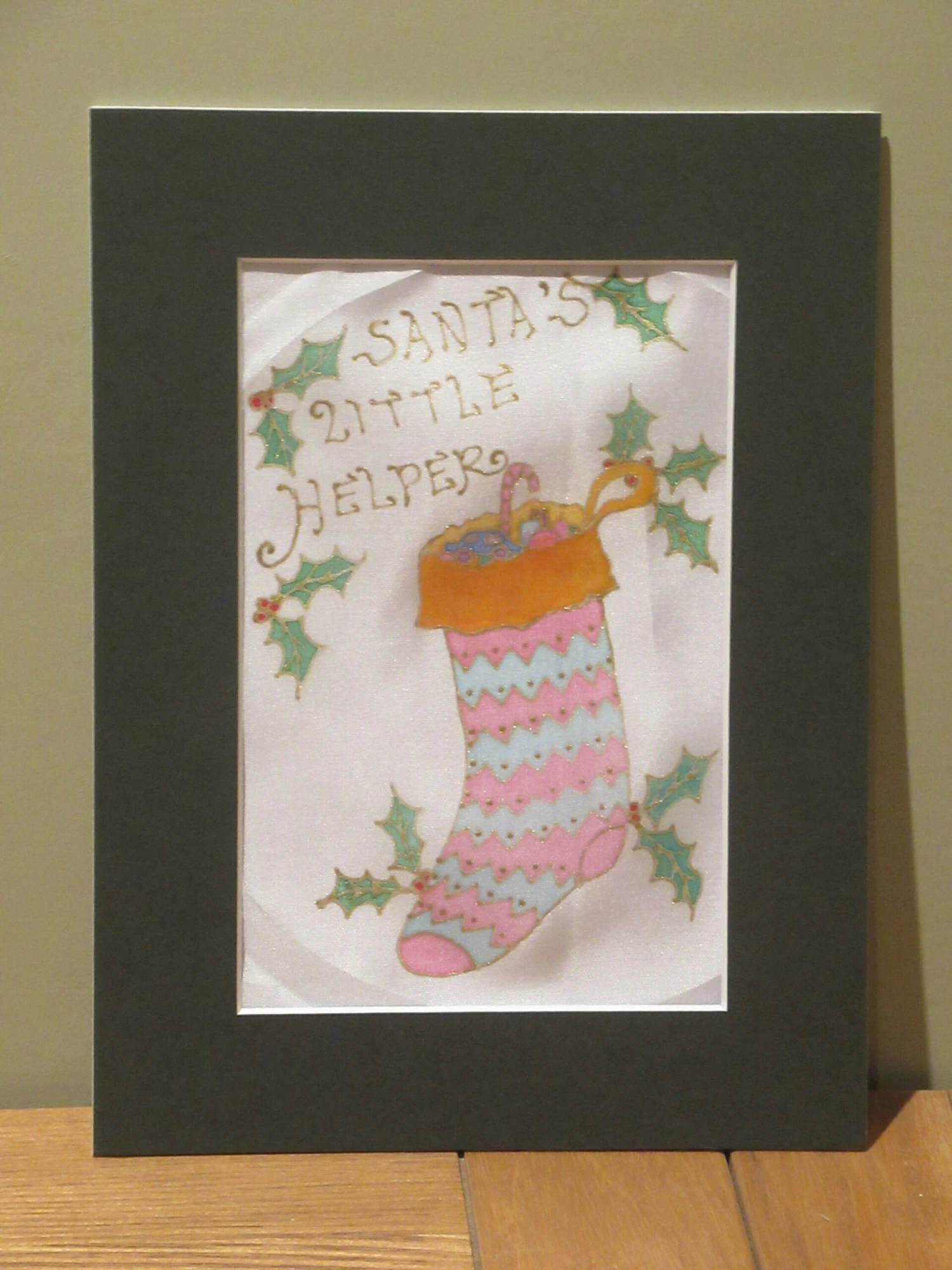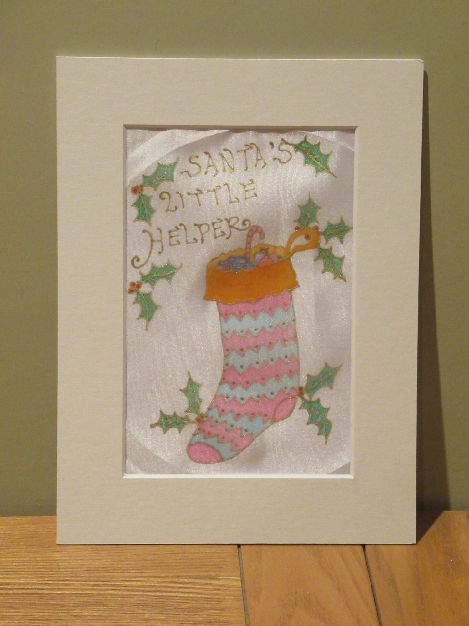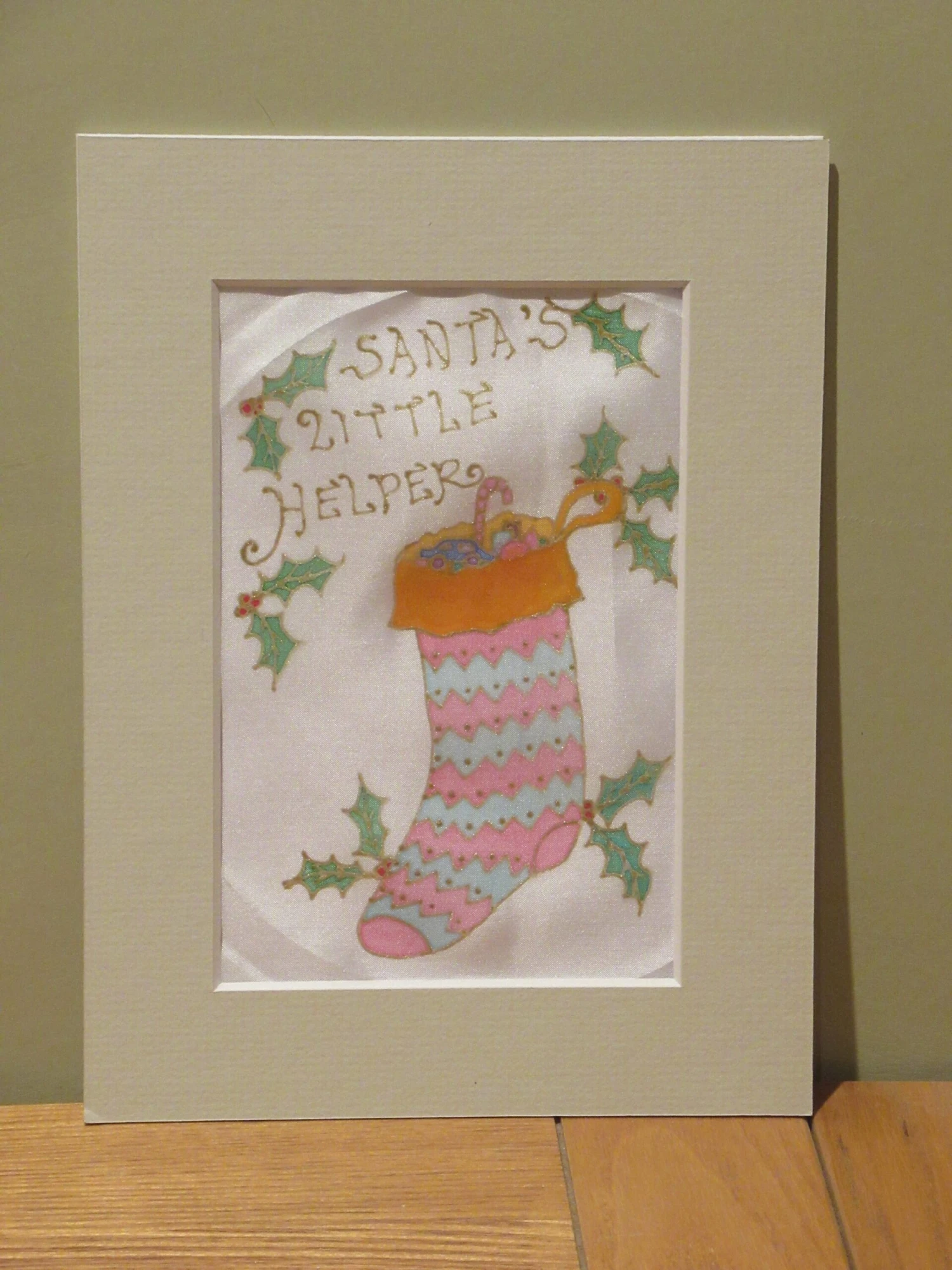An original Christmas inspired Silk Painting ‘Santa’s Little Helper – Personalised Stocking’.