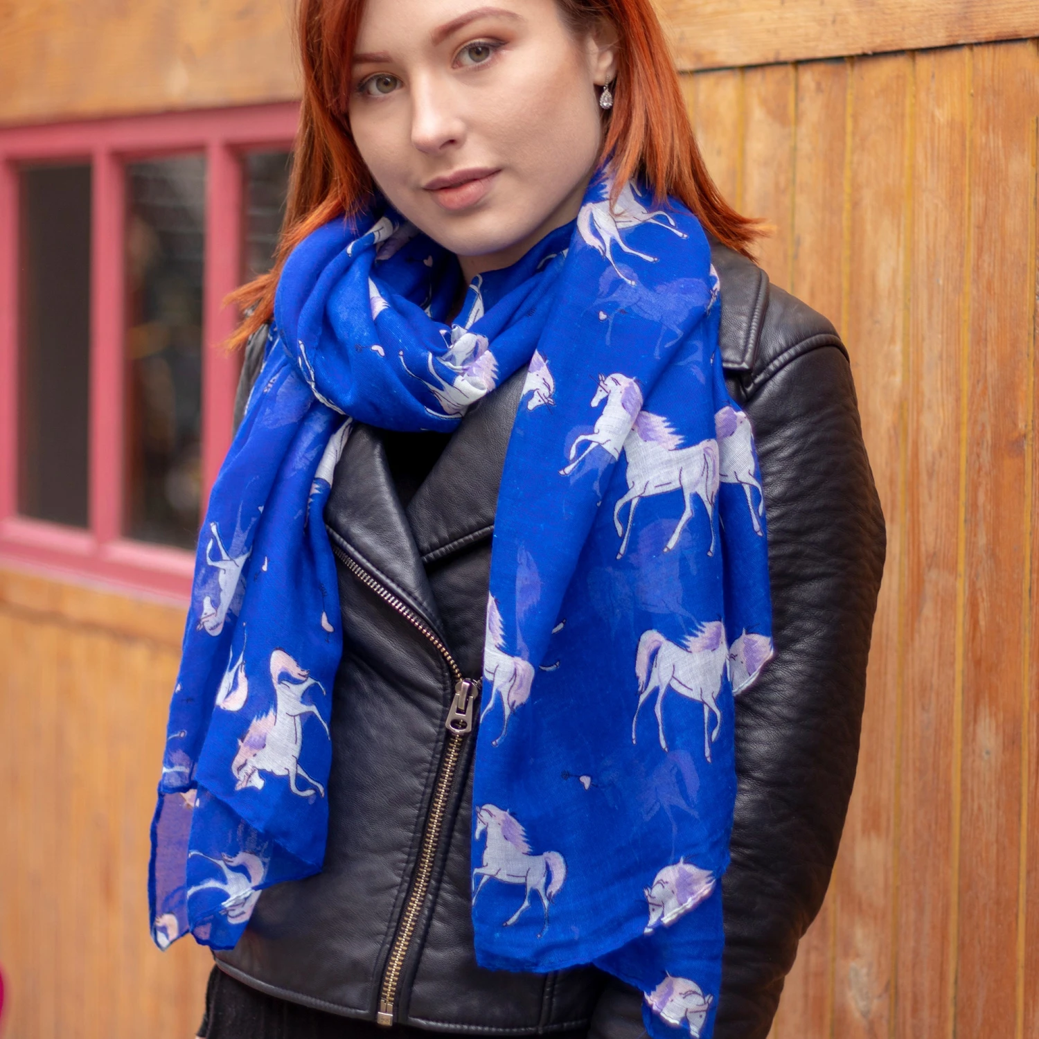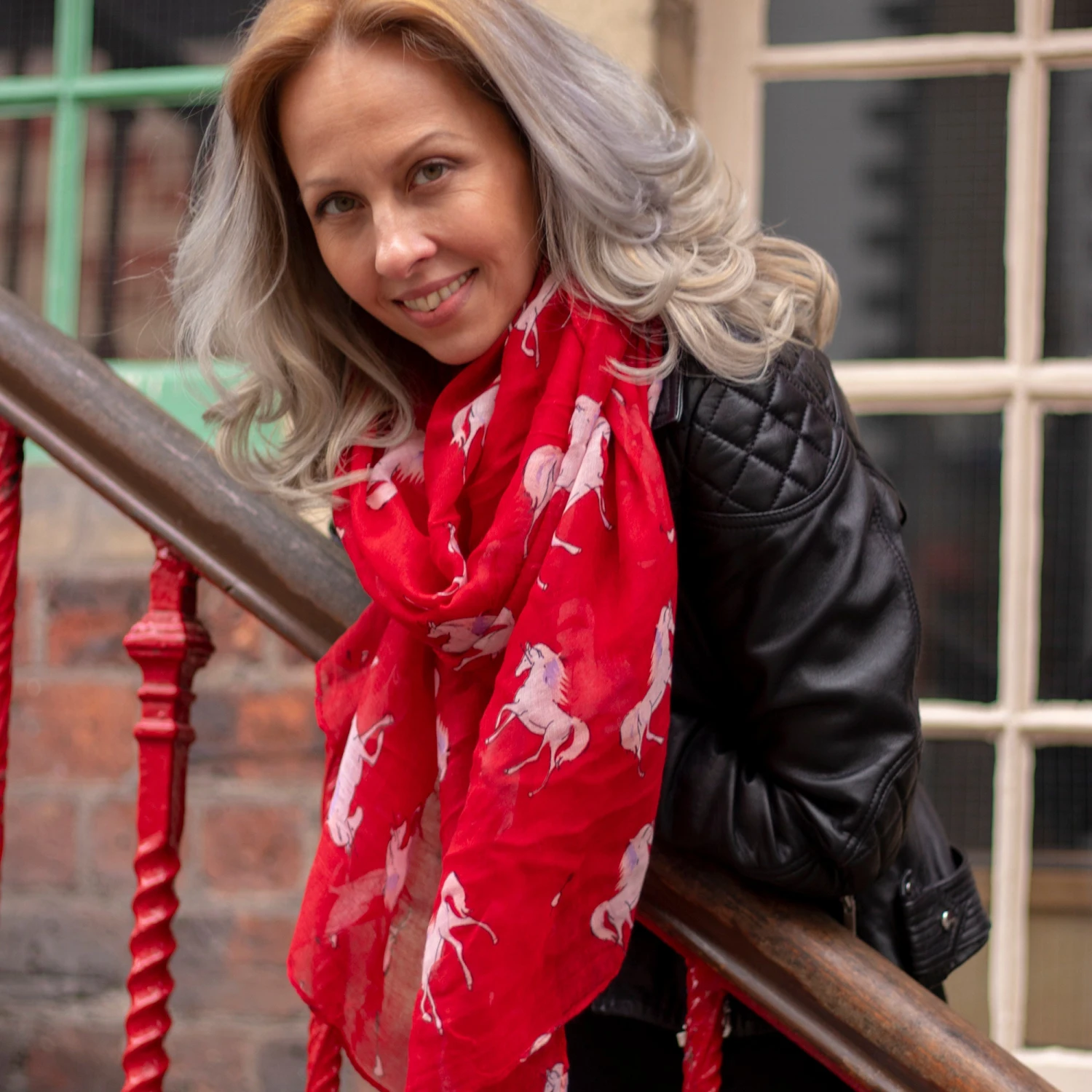 A unique , fun and really lovely illustrated unicorn scarf. This scarf has a really lovely soft feel to it, which makes it fall beautifully. It comes in a range of colours: Dusty Pink, Pale Blue, Bold Red, Royal Blue, and Teal.