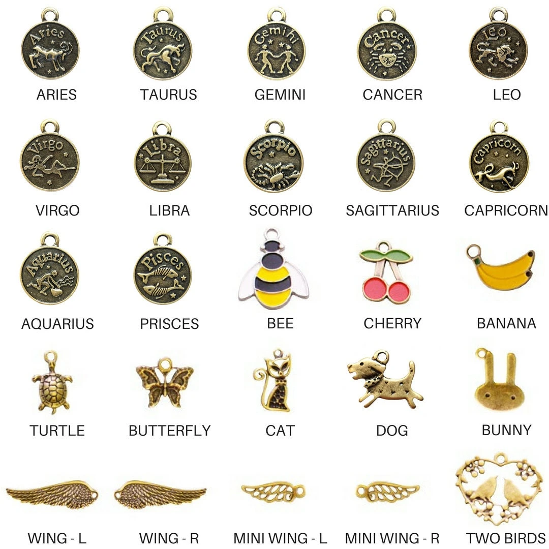 | FERNWORKS CHARMS | No Charm, Anchor, Arc de Triomphe, Airplane, Aquarius, Aries, Australia Map, Bee, Banana, Bicycle, Binocular, Butterfly, Cancer, Capricorn, Cat, Cherry, Compass, Dog, Eiffel Tower, Fern, Gemini, Jet Aircraft, Kangaroo, Koala, Opera House, London Bus, Leo, Libra, Lucky Charm, Luggage, Mini Wing – Left, Mini Wing – Right, Piano, Pisces, Sagittarius, Saxophone, Scorpio, Small Camera, Snowflake, TukTuk, Taurus, Virgo, Wing – Left, Wing – Right, Tree (as sample) |