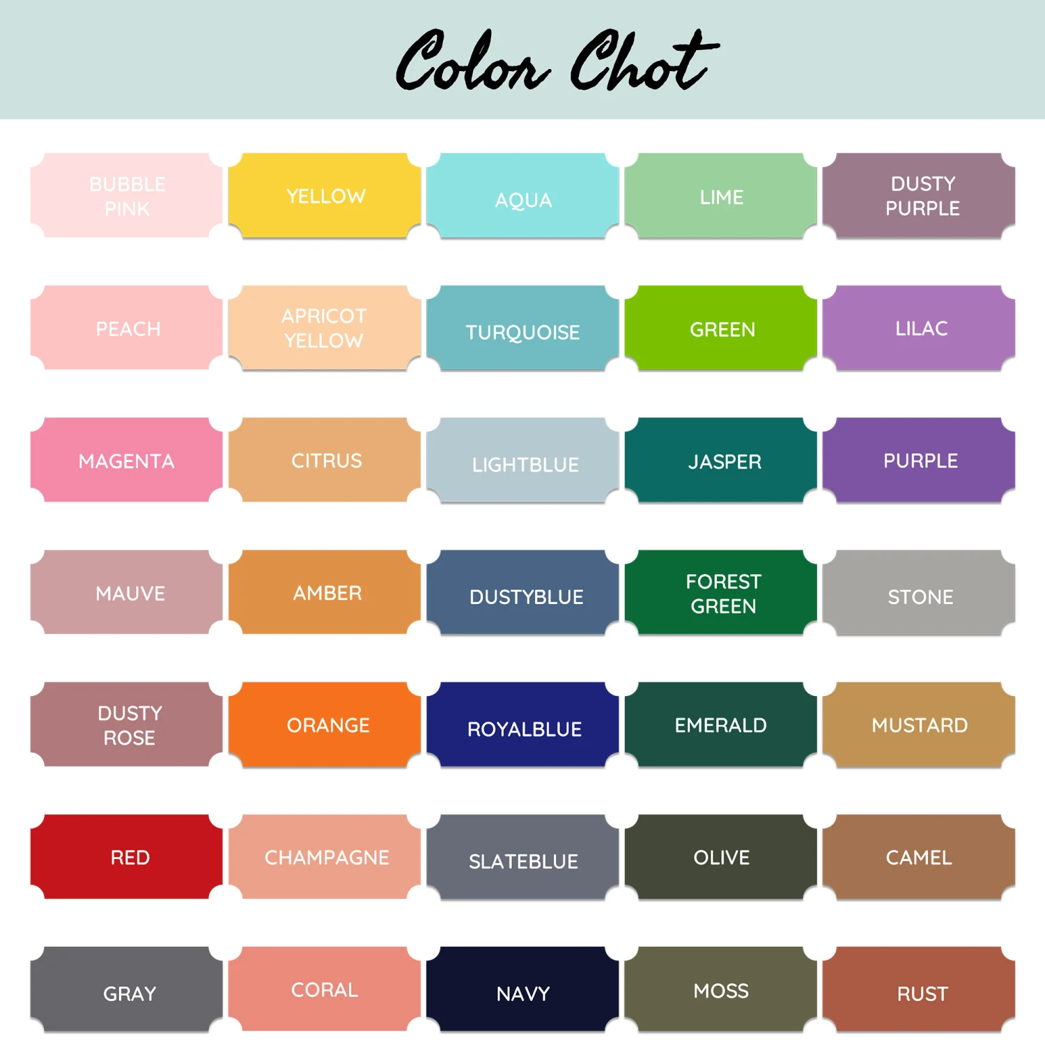 | Primary colour | Bubble Pink, Peach, Magenta, Mauve, Dusty Rose, Red, Gray, Yellow, Apricot Yellow, Citrus, Amber, Orange, ChamPagne, Coral, Aqua, Turquoise, Light Blue, Dusty Blue, Royal Blue, Slate Blue, Navy, Lime, Green, Jasper, Forest Green, Emerald, Olive, Moss, Dusty Purple, Lilac, Purple, Stone, Mustard, Camel, Rust |