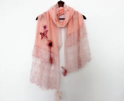 The stitched branches made of salmon pink and lace fabric are carefully sewn. You will love the slim, soft, airy and very accustomed accessories, clean workmanship and quality materials applique made individually hand made ornaments. And as applique fabric. Bride and bridesmaid suitable for shawls. Romantic and volatile colors.
