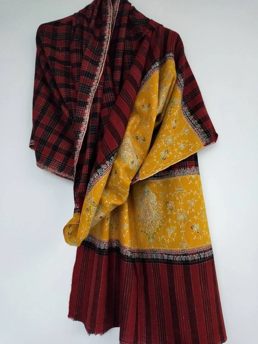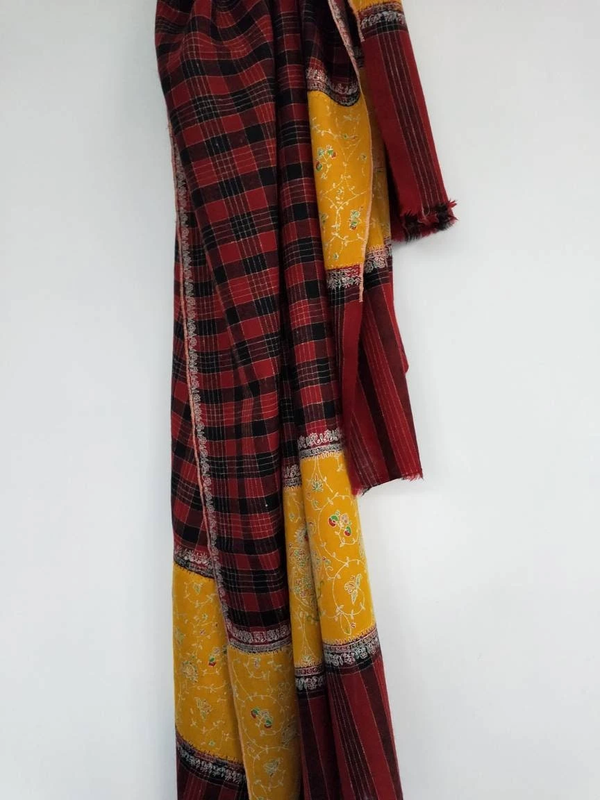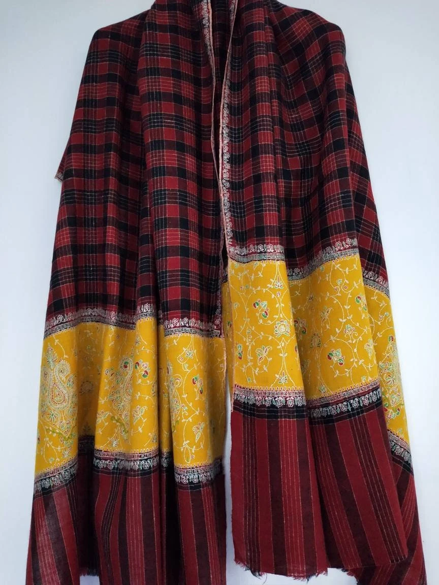 • Handcrafted 100% Pure kashmir Pashmina yellow palla sozni Embroidered multi color black and burgundy check shawl. Incredibly Warm and Breathable Cashmere pashmina for Lavish Softness and Durability.