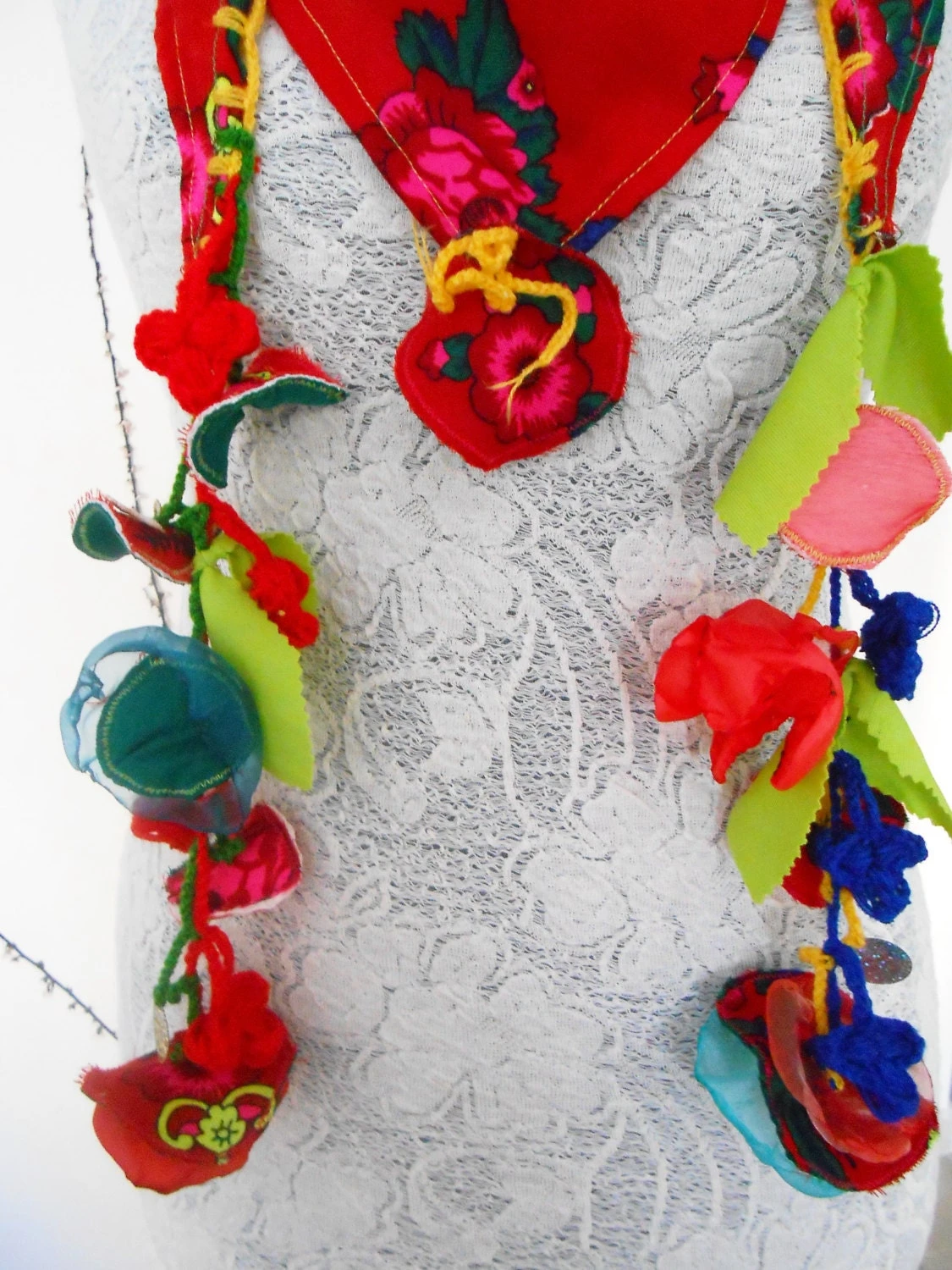 Materials: red Turkish fabric, handmade, flowers, leaves, crochet, sewing, red ethnic fabric
