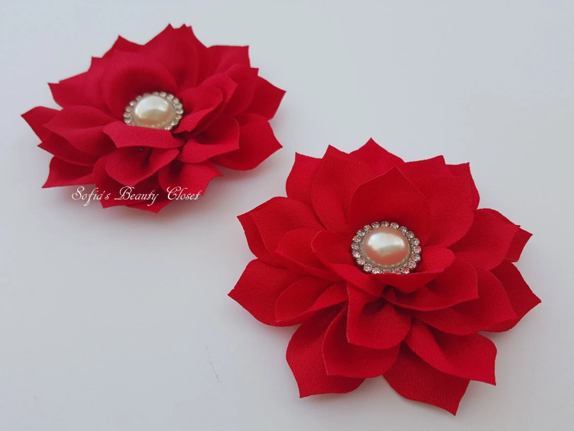 This beautiful red flower is topped with fancy pearl rhinestone and come on an attached alligator clip.