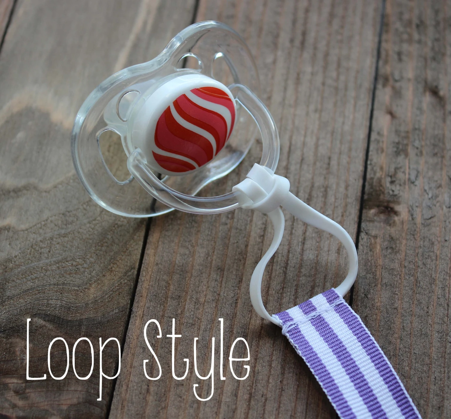 On the other end of the ribbon strap, we offer two different pacifier attachment styles. When using the snap style, simply loop the ribbon through the pacifier’s handle and snap it closed. The loop style has an elastic loop sewn on that can be threaded through an opening in the pacifier and then doubled back to create a slip knot.