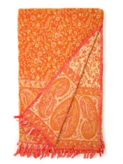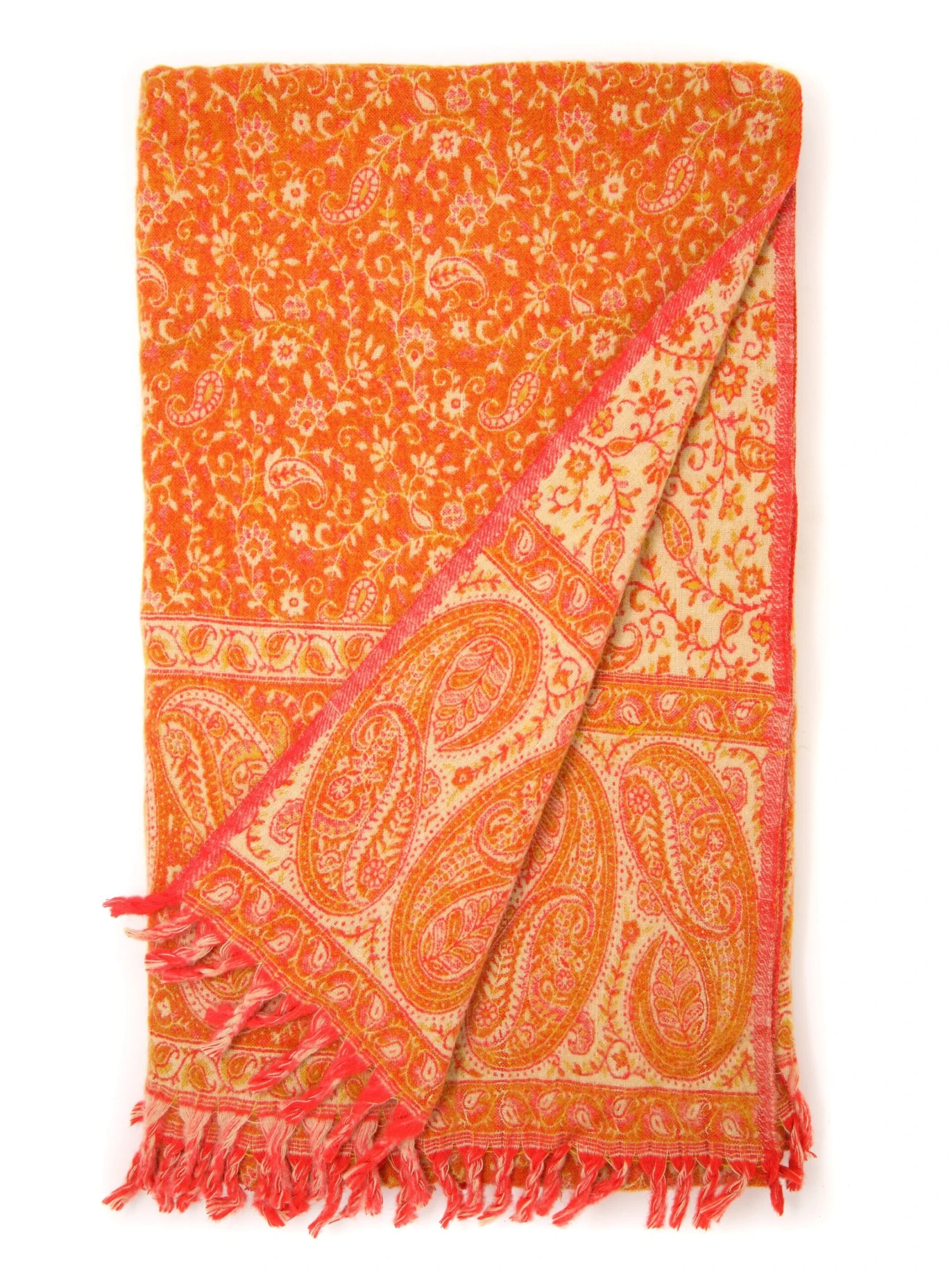 The only vibrant cosy scarf you will ever need. This wool shawl with orange and cream colours decorated with a paisley design compliments each reverse side of this shawl.