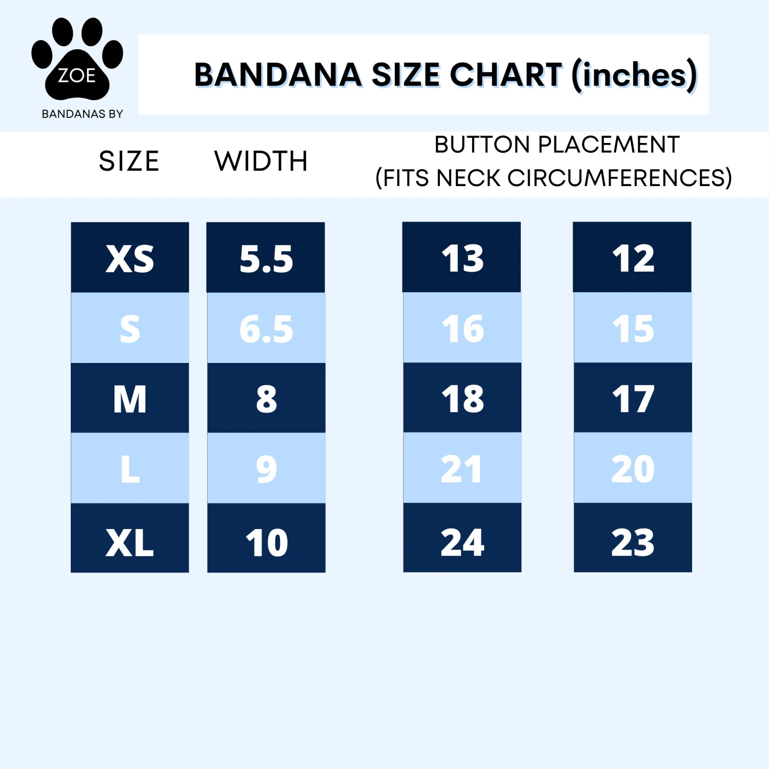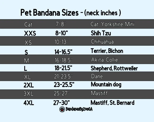 | Bandana Sizes | Bandana Cat 7", Bandana XXS 10", Bandana XS 14", Bandana S 16.5", Bandana M – 19.5", Bandana L 22", Bandana XL 24", Bandana 2XL 25.5", Bandana 3XL 27", Bandana 4XL – 30" |