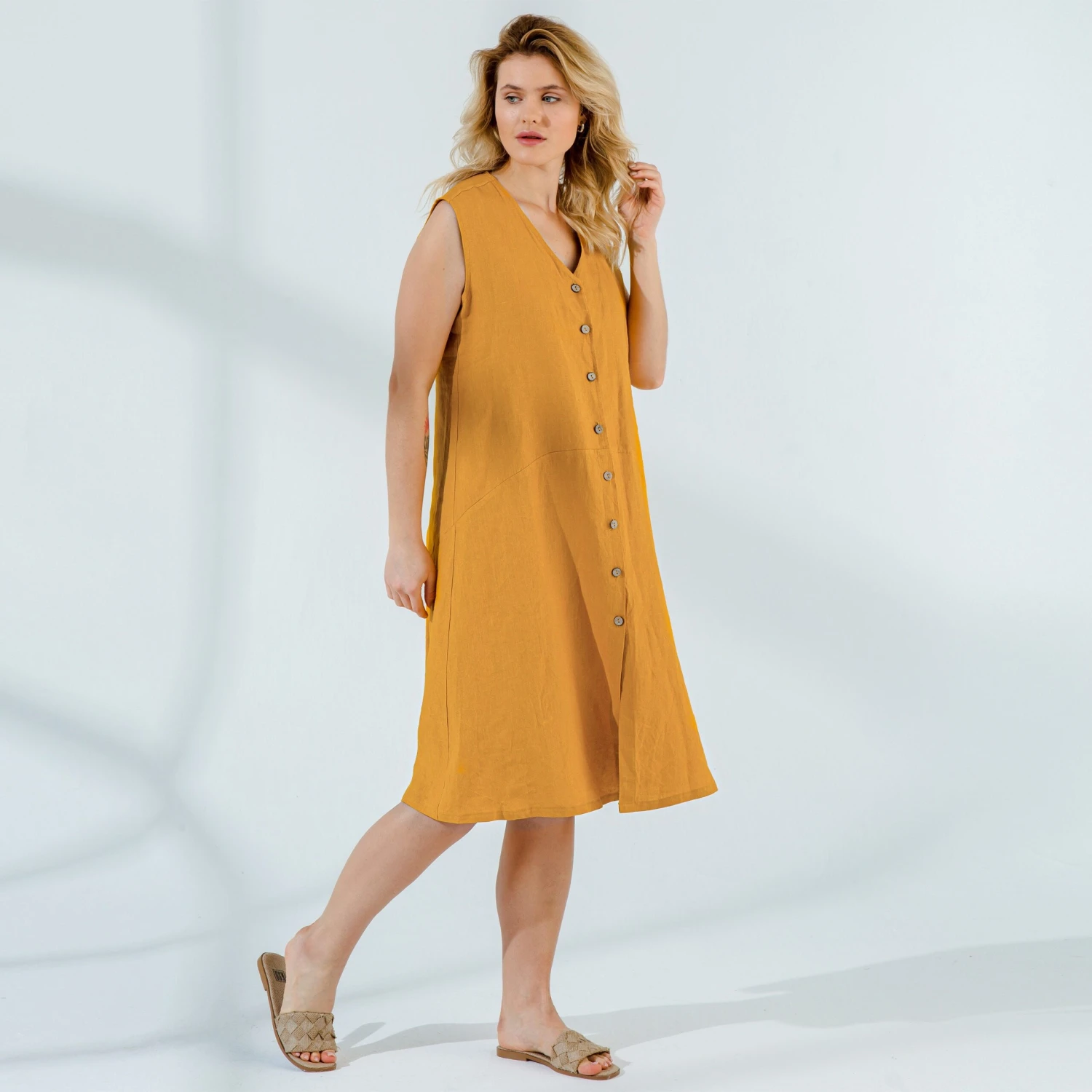 Sleeveless V Neck Linen Button Down Dress With Elastic Band At The Back | Summer Linen Dress – 1009-1 – Christmas Gift – Gift For Her