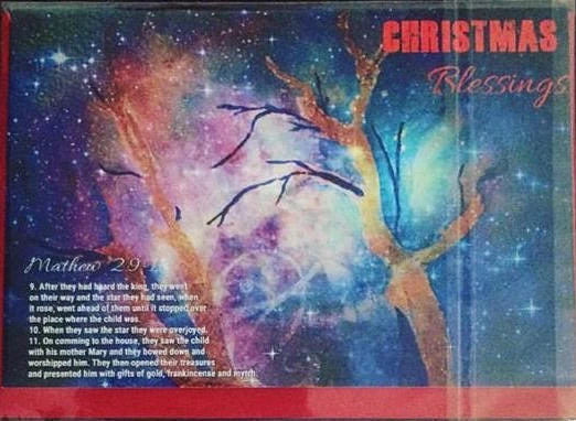 Christmas Blessings – A starry night with Australian stylised trees in gold leaf. Features a bible verse:Mathew 2:9-11