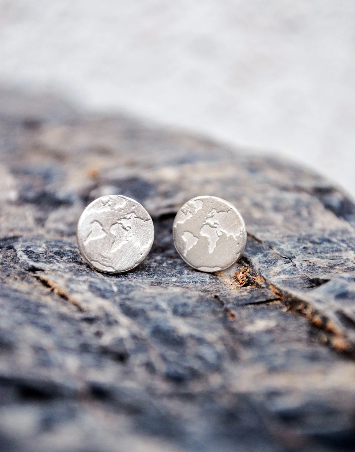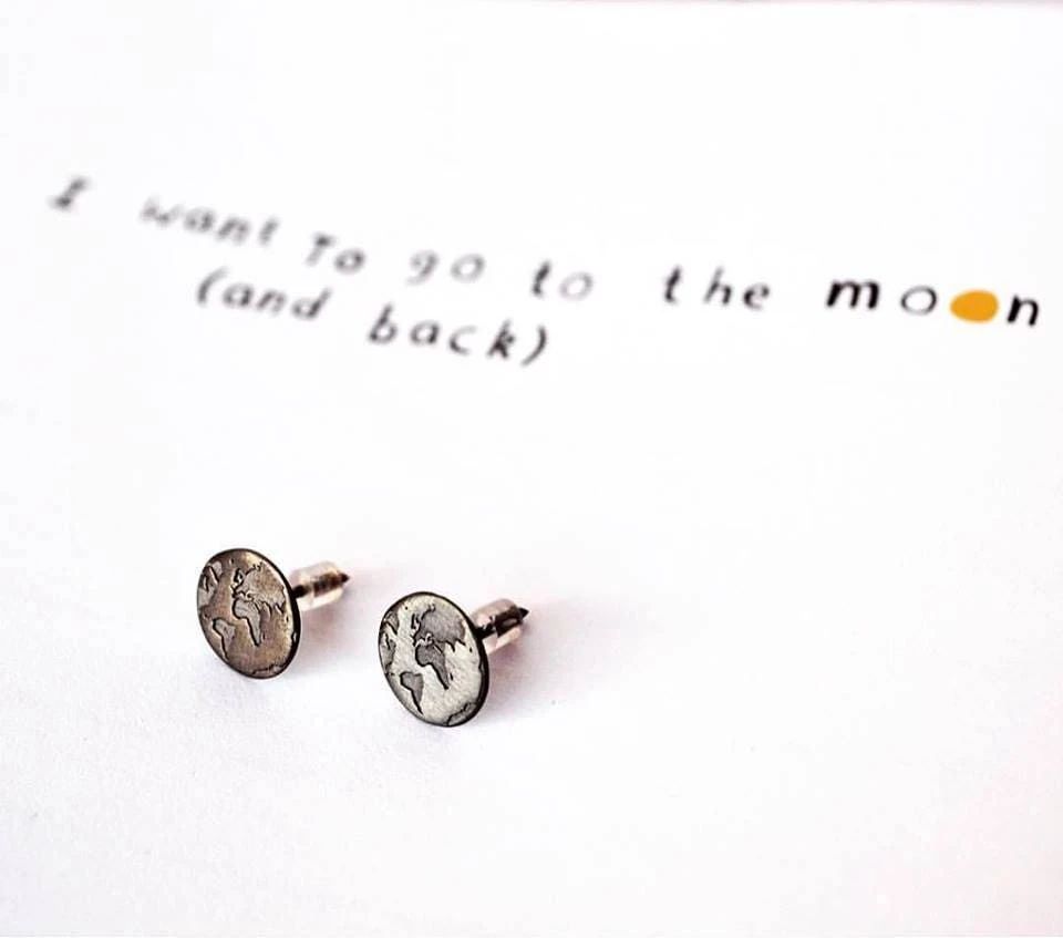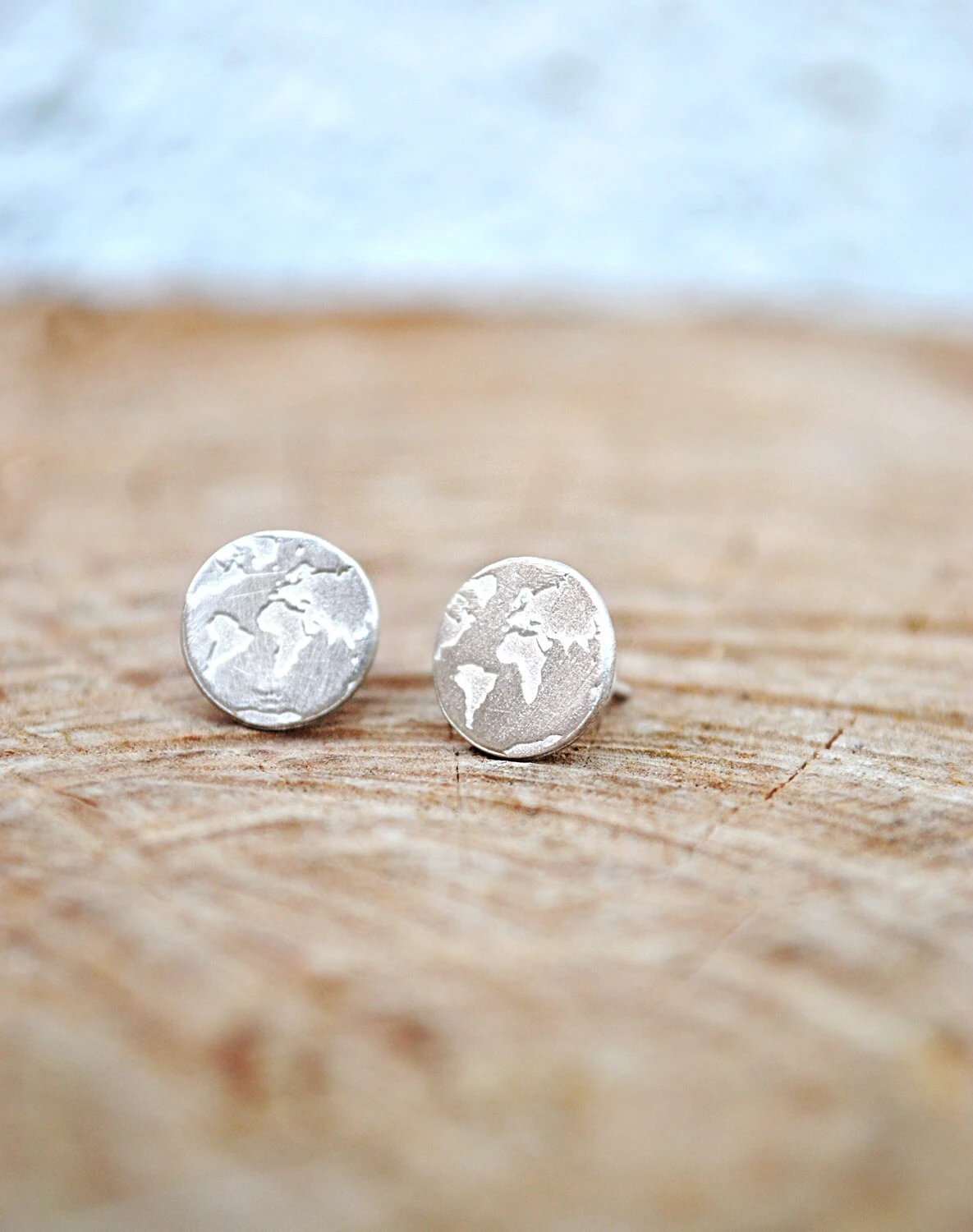 Handmade Travel Earrings with world map engraving are a great reminder of our travels and a hint of daily inspiration.