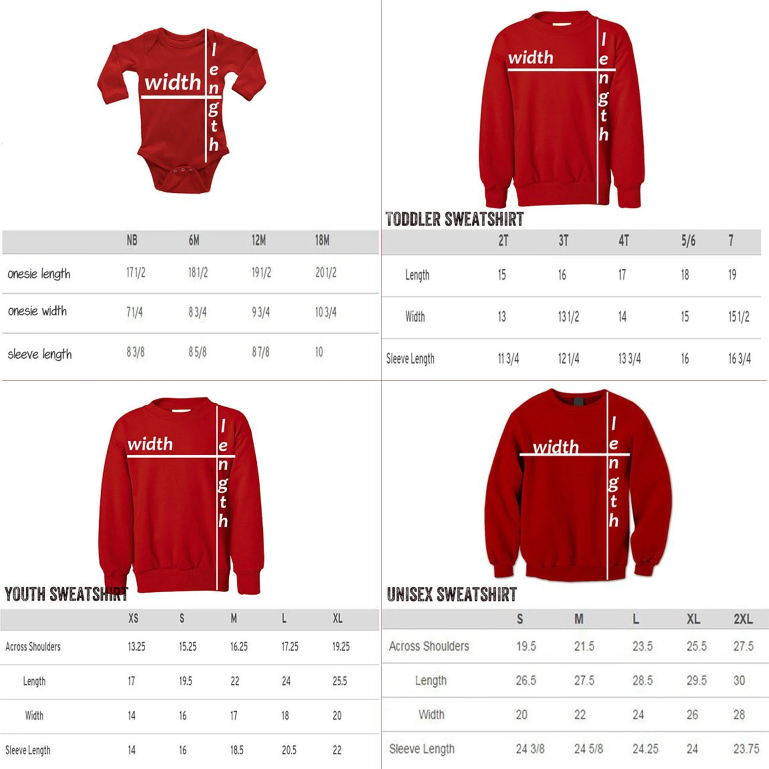 | Size | Onesie NB, Onesie 6M, Onesie 12M, Onesie 18M, Toddler sweater 2T, Toddler sweater 3T, Toddler sweater 4T, Toddler sweater 5/6T, Toddler sweater 7, Tod.long sl.shirt 2T, Tod.long sl.shirt 3T, Tod.long sl.shirt 4T, Tod.longsl.shirt5/6T, Youth Kids XS, Youth Kids S, Youth Kids M, Youth Kids L, Youth Kids XL, Adult unisex S, Adult unisex M, Adult unisex L, Adult unisex XL, Adult unisex 2XL, Adult unisex 3XL |