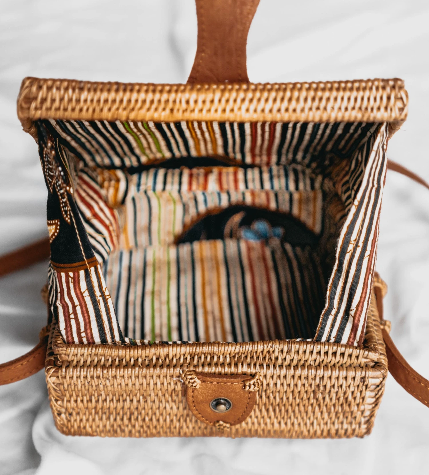 Introducing the Vegan Sumatra Square Rattan Bag – a captivating fusion of uniqueness and popularity in our collection. With its distinctive geometric shape and practical size, it effortlessly balances edginess with functionality, offering ample space for your essentials. This versatile medium-sized, hard case bag features an vegan leather adjustable strap and buckle, ensuring both style and comfort. Personalize your Sumatra with a choice of exclusive cotton or linen linings, or embrace the rich cultural tapestry of a surprise Balinese batik fabric. It’s designed to comfortably hold your iPhone Plus, sunglasses, keys, most wallets, as well as your go-to basics like chapstick and headphones, making it a must-have accessory.