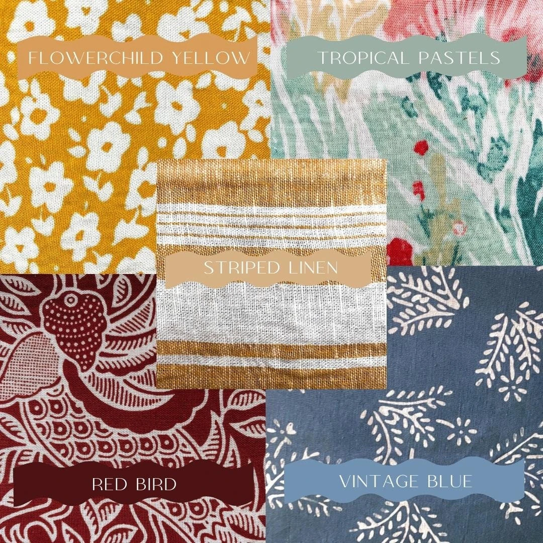 | Fabric | Surprise Fabric [Sold out], Red Bird, Tropical Pastels [Sold out], Flowerchild Yellow, Vintage Blue [Sold out], Striped Linen [Sold out] |