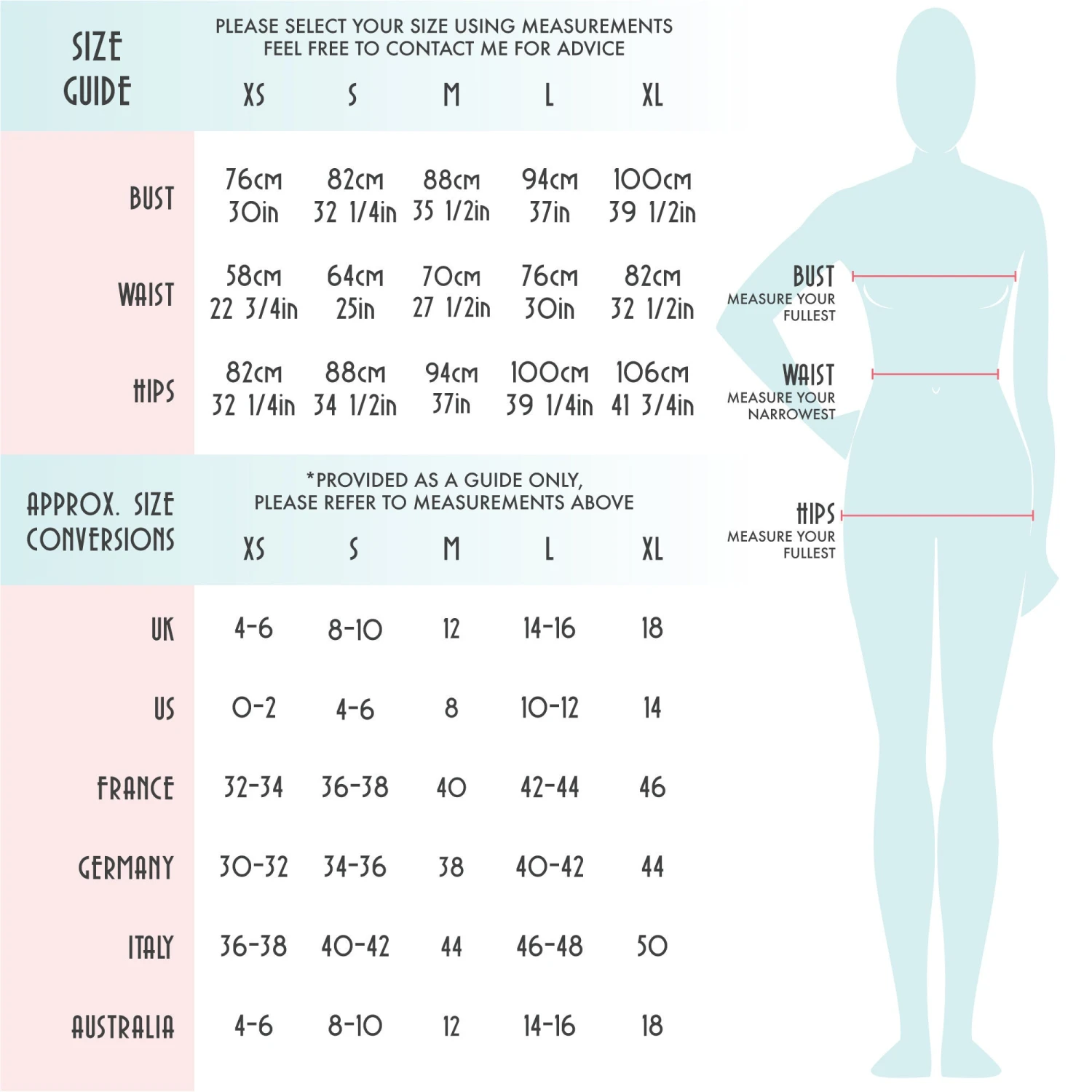 Please see the size chart within images for equivalent global sizing and approximate body measurements.