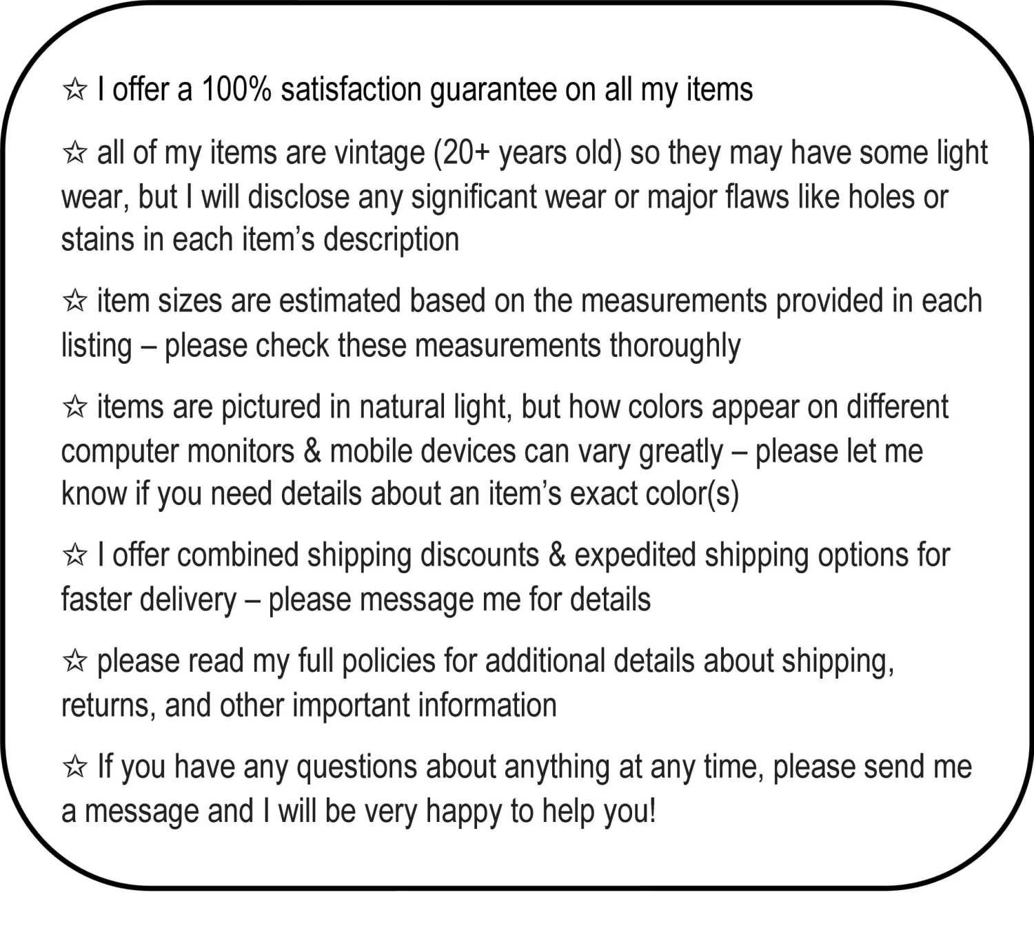 ✩ all my items are vintage so they may have some light wear, but I will disclose any major flaws in the description above