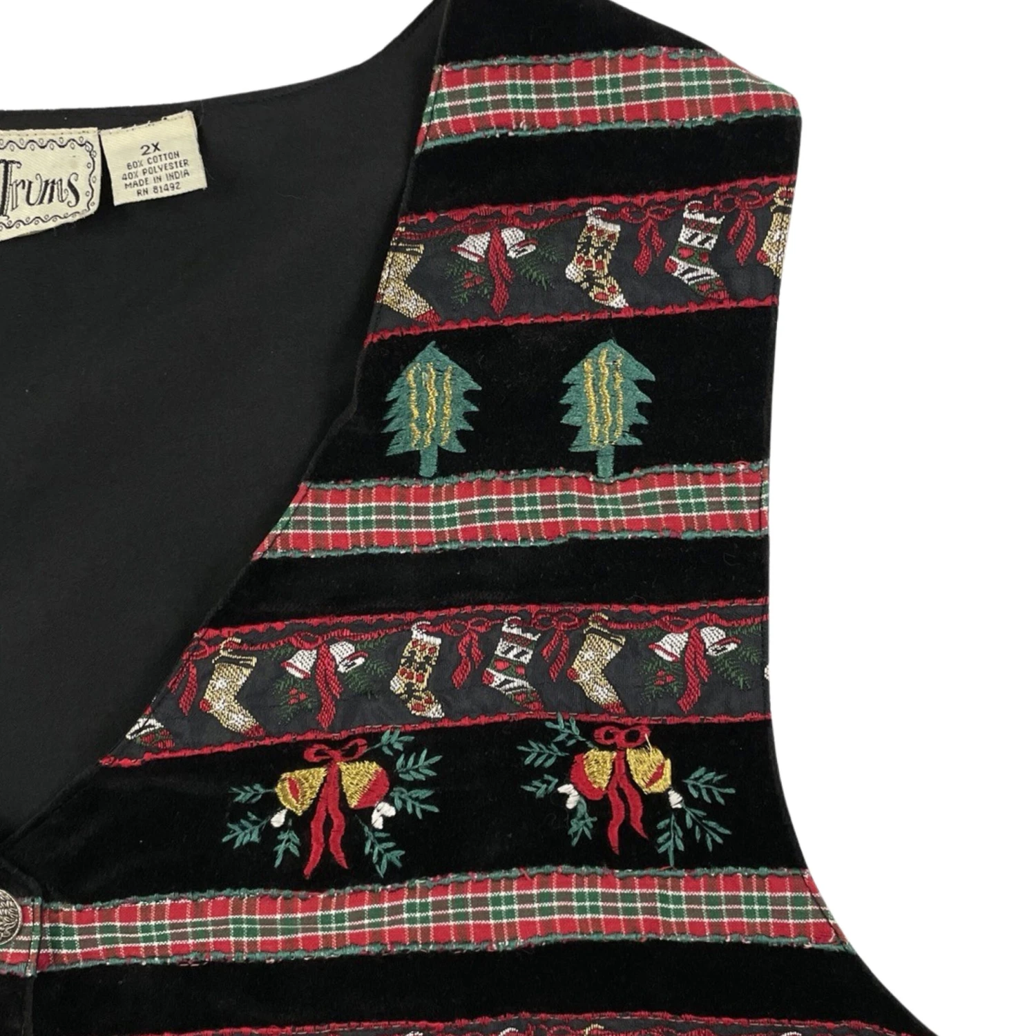 Black velour vest with Christmas themed tapestry bands & embroidery. Button down front.