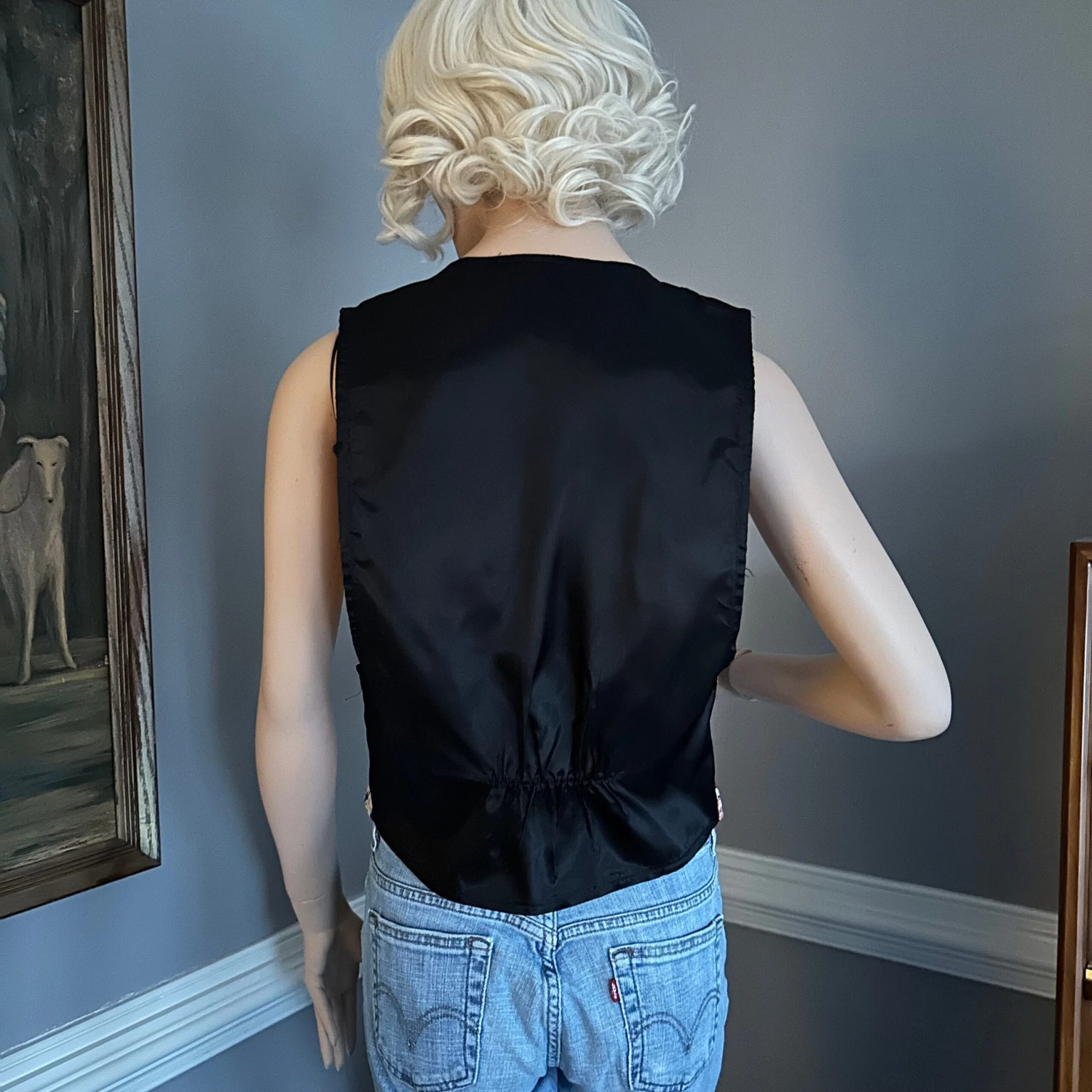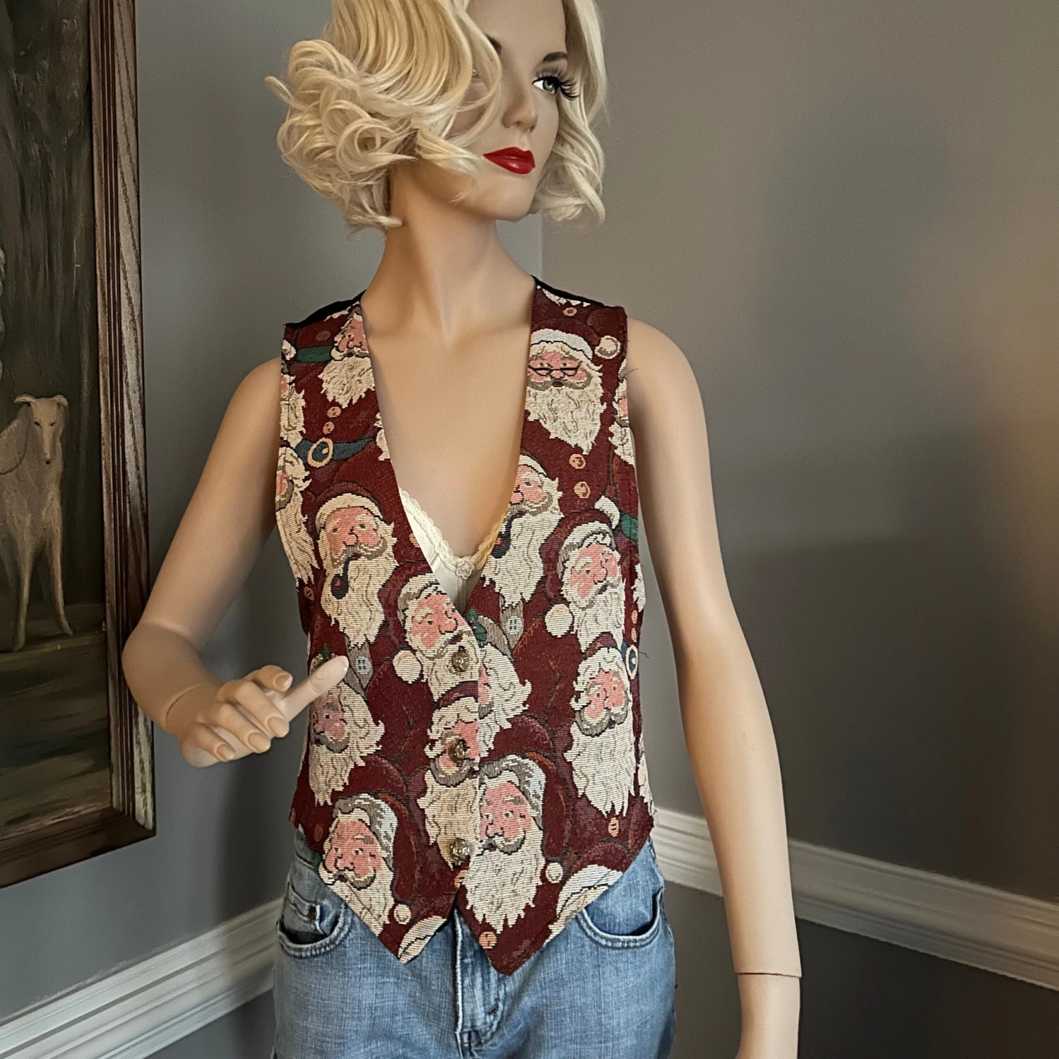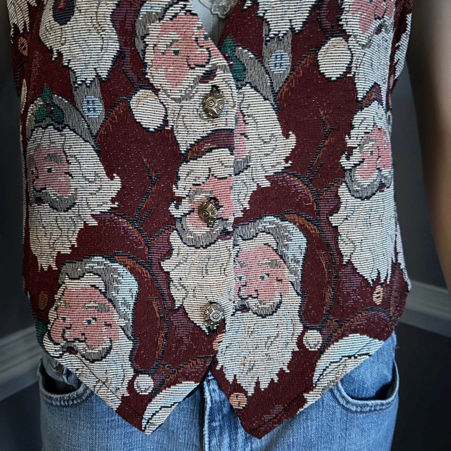 Vintage 90s novelty Christmas tapestry vest. Positively covered in Santa Clauses! Three button closure. Gathered with elastic on back/center for prefect fit. I believe the front is cotton/ polyester blend. Back and partial front lining is poly. No tags on this one but it is so similar to snowman vest listed separately that came from the same estate. Size estimate Medium. Check out my shop for more fun vests!