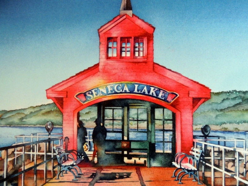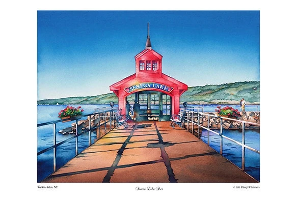This Art Print titled “Seneca Lake Pier”, in the Finger Lakes is beautifully reproduced from my original watercolor. Surrounded by rolling hills, Seneca Lake is the deepest and widest of the Finger Lakes. The clear blue water and sky contrast with the bright red iconic pier at the southern end in the village of Watkins Glen.